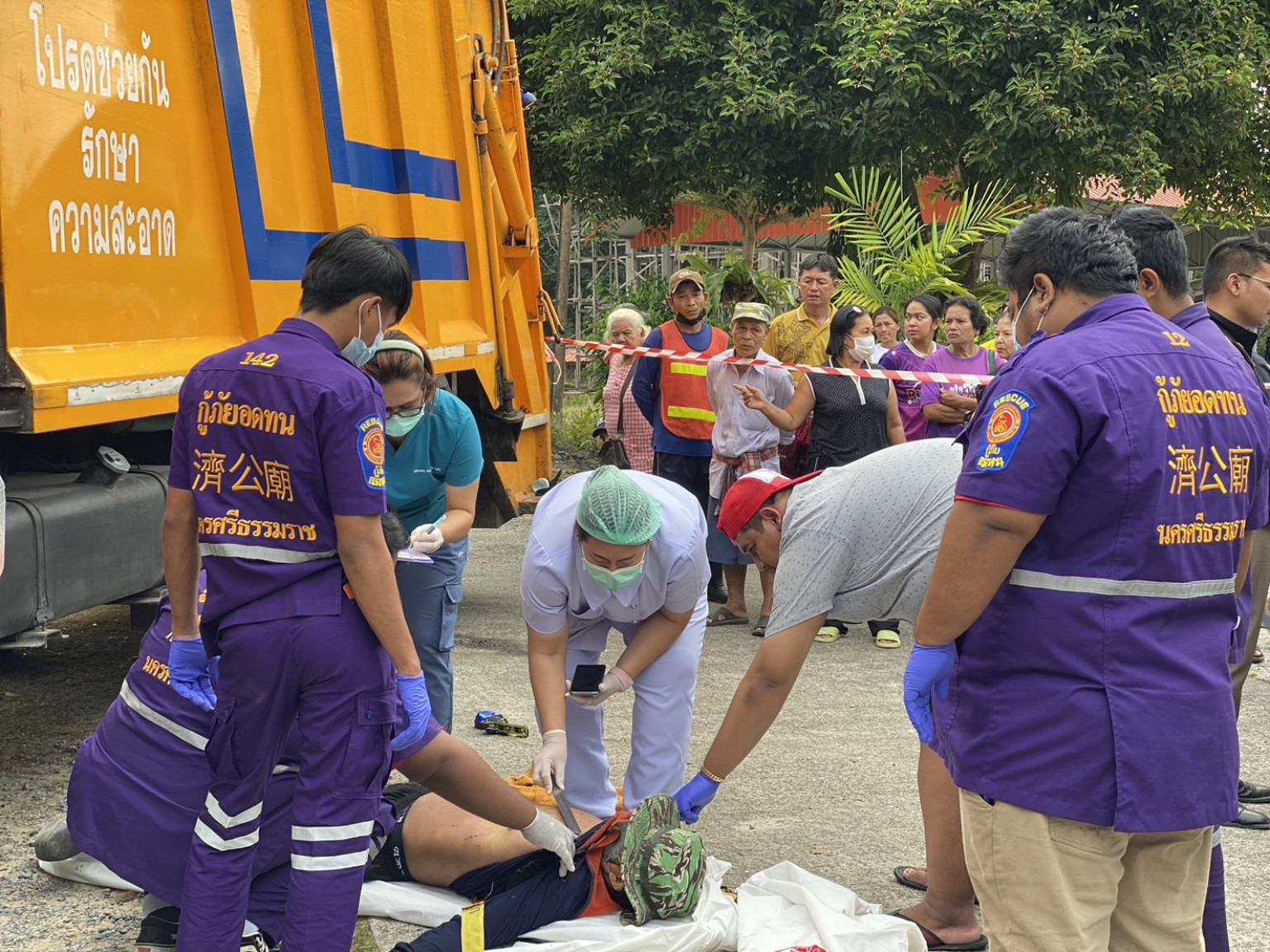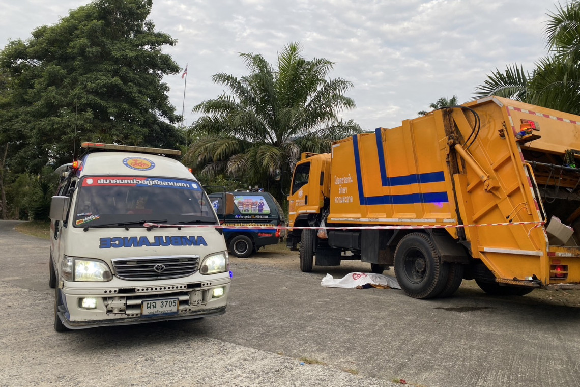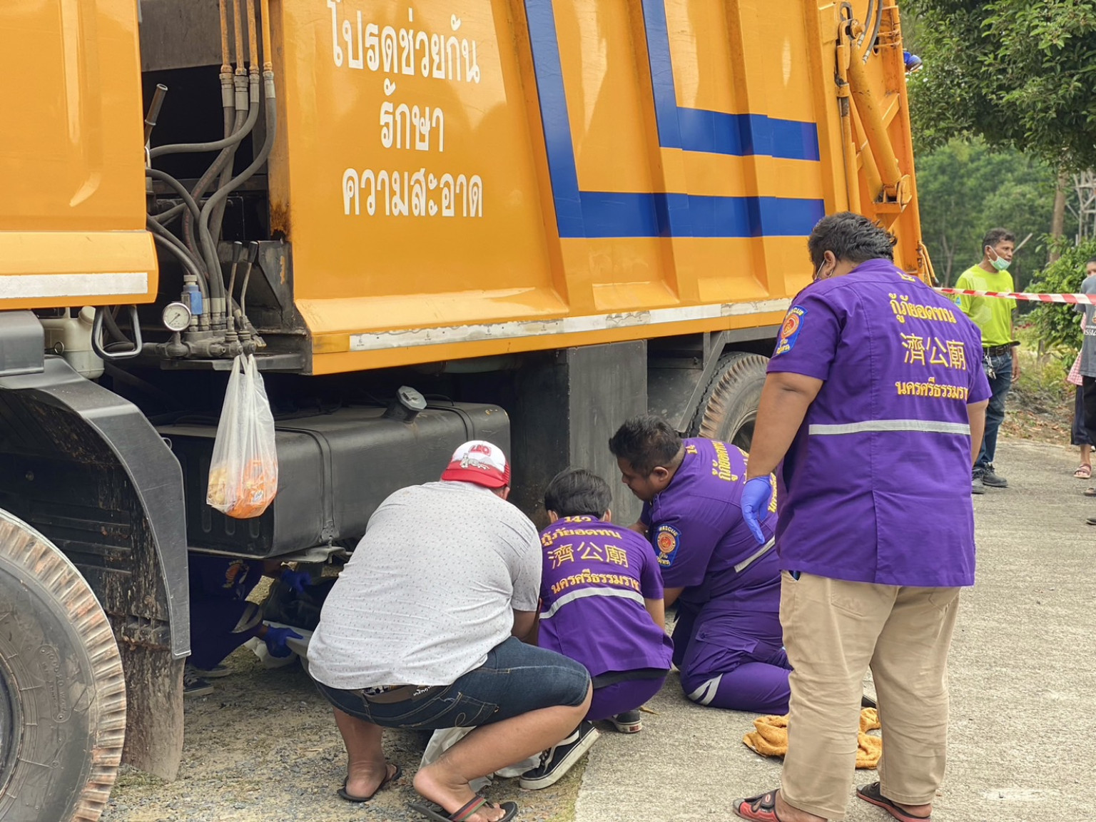 ในที่เกิดเหตุเจ้าหน้าที่พบรถบรรทุกขยะชนิด 6 ล้อใหญ่ บรรทุกขยะแบบบีบอัดจอดอยู่ ด้านซ้ายของตัวรถพบร่างของผู้เสียชีวิตอยู่ชุดเสื้อสะท้อนแสงสีส้ม ระบุ อบต.กำโลน ทราบชื่อคือนายยอดชาย อายุ 47 ปี อยู่หมู่ 3 ตำบลกำโลน อำเภอลานสกา นครศรีธรรมราช สภาพถูกรถทับร่างช่วงหน้าอกบอบช้ำอย่างรุนแรง