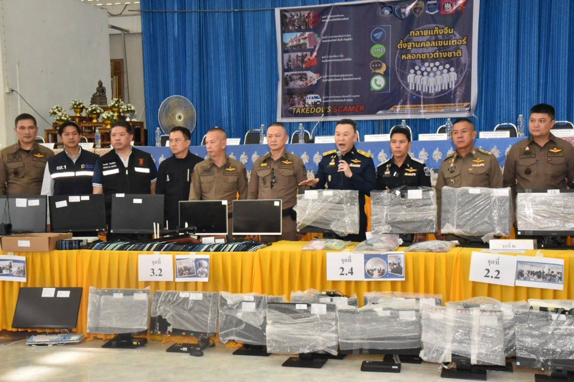 พล.ต.ท.ธัชชัย เปิดเผยว่า จากนโยบายของ นายเศรษฐา ทวีสิน นายกรัฐมนตรี มอบหมายให้ สำนักงานตำรวจแห่งชาติ กวดขัน ปราบปรามอย่างเด็ดขาดกับอาชญากรรมออนไลน์ โดยเฉพาะอย่างยิ่งแก๊งคอลเซ็นเตอร์ ซึ่งสร้างความเดือนร้อนให้กับประชาชนเป็นอย่างมาก พล.ต.อ.กิตติ์รัฐ พันธุ์เพ็ชร์ รองผู้บัญชาการตำรวจแห่งชาติ ( รอง ผบ.ตร. ) รักษาราชการแทน ผบ.ตร. จึงได้สั่งการให้ทุกหน่วยตำรวจในพื้นที่บูรณาการหาข่าว ปราบปรามขยายผลให้ถึงผู้บงการ ยึดทรัพย์ และนำตัวมาดำเนินคดีอย่างเคร่งครัด ซึ่งได้ปรากฏทางการสืบสวนพบว่า มีกลุ่มแก๊งอาชญากรรมข้ามชาติมาตั้งฐานอยู่ทางภาคใต้ จึงได้สั่งการให้ พล.ต.ท.ธัชชัย ปิตะนีละบุตร ผู้ช่วย ผบ.ตร. บูรณการกำลังเข้าปฏิบัติการ จากการสืบสวนสอบสวนเชิงรุกของตำรวจ ร่วมกับ กสทช.และ กรมสอบสวนคดีพิเศษ หรือ ดีเอสไอ พบความเคลื่อนไหวของกลุ่มคนร้ายแก๊งคอลเซ็นเตอร์ในพื้นที่จังหวัดนครศรีธรรมราช ผนวกกับการตรวจสอบแลกเปลี่ยนข้อมูลกัน ตำรวจ สอท. 5 จึงได้รวบรวมพยานหลักฐาน ขออนุมัติหมายค้นจากศาล เข้าตรวจค้น 3 จุด จุดแรกโรงแรมแห่งหนึ่งในตำบลจันดี อำเภอฉวาง จังหวัดนครศรีธรรรมราช และอีก 2 จุด คือ บ้านพัก ใน อ.ฉวาง ขยายผลไปยัง โกดังจำหน่ายสินค้าญี่ปุ่นมือสอง ในพื้นที่ อ.นาบอน จ.นครศรีธธรมราช พบผู้ต้องหา และของกลางจำนวนมาก โดยพบความเชื่อมโยงกัน สถานที่ดังกล่าวถูกใช้เป็นฐานของแก๊งคอลเซ็นเตอร์ข้ามชาติ ที่ทำเป็นขบวนการแบ่งหน้าที่กันทำอย่างชัดเจน โดยจับกุมผู้ร่วมขบวนการได้ 63 ราย สัญชาติไทย 12 ราย สัญชาติอื่น 51 ราย พร้อมของกลาง 1. คอมพิวเตอร์ 223 เครื่อง ,2. โทรศัพท์มือถือ และซิมการ์ดผี 1,300 รายการ,3. เราเตอร์กระจายสัญญาณ 12 เครื่อง4 .สมุดบัญชีธนาคาร ( บัญชีม้า ) 80 เล่ม
