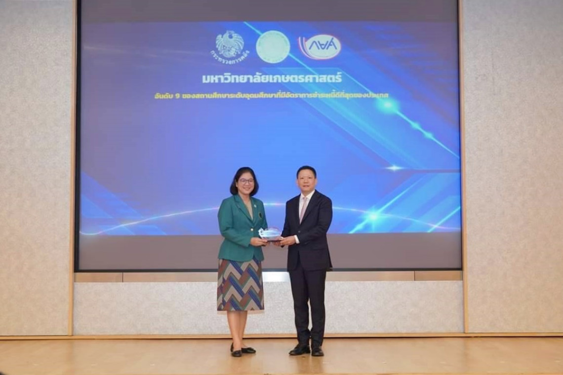 เมื่อวันที่ 29 มี.ค.67 ผศ.ดร.สุรัสวดี อรุณวรากรณ์ ผู้ช่วยอธิการบดีฝ่ายกิจการนิสิต มหาวิทยาลัยเกษตรศาสตร์ เป็นผู้แทนอธิการบดีมหาวิทยาลัยเกษตรศาสตร์ เข้ารับมอบโล่ประกาศเกียรติคุณ “สถานศึกษาระดับอุดมศึกษาที่มีอัตราการชำระหนี้ดีที่สุด 25 อันดับแรกของประเทศ” จากนายลวรณ แสงสนิท ปลัดกระทรวงการคลัง ประธานกรรมการกองทุนเงินให้กู้ยืมเพื่อการศึกษา โดยมหาวิทยาลัยเกษตรศาสตร์ มีอัตราการชำระหนี้คืนกองทุนฯ เป็นลำดับที่ 9 ของประเทศ ณ ห้องประชุมวายุภักษ์ 4 ชั้น 4 กระทรวงการคลัง