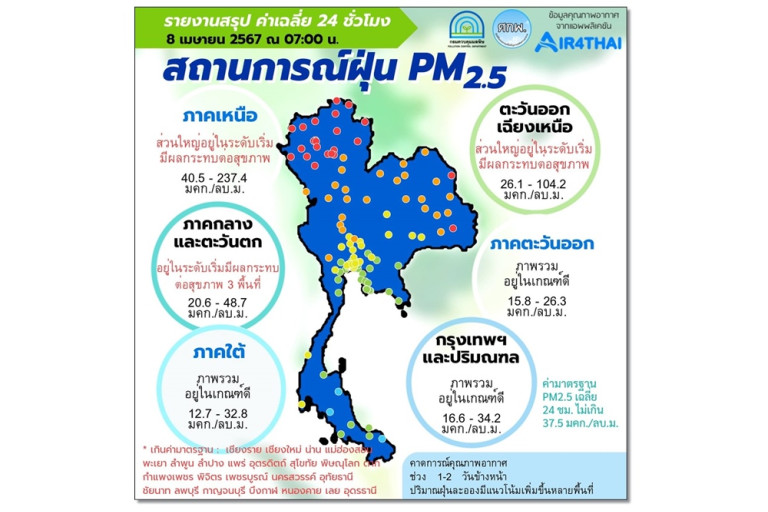ภาพรวมปริมาณ PM2.5 ในประเทศพบเกินค่ามาตรฐานใน จ.เชียงราย จ.เชียงใหม่ จ.น่าน จ.แม่ฮ่องสอน จ.พะเยา จ.ลำพูน จ.ลำปาง จ.แพร่ จ.อุตรดิตถ์ จ.สุโขทัย จ.พิษณุโลก จ.ตาก จ.กำแพงเพชร จ.พิจิตร จ.เพชรบูรณ์ จ.นครสวรรค์ จ.อุทัยธานี จ.ชัยนาท จ.ลพบุรี จ.กาญจนบุรี จ.บึงกาฬ จ.หนองคาย จ.เลย จ.อุดรธานี จ.นครพนม จ.หนองบัวลำภู จ.สกลนคร จ.มุกดาหาร จ.ขอนแก่น จ.กาฬสินธุ์ จ.ร้อยเอ็ด จ.อำนาจเจริญ จ.ยโสธร จ.อุบลราชธานี และ จ. ศรีสะเกษ
