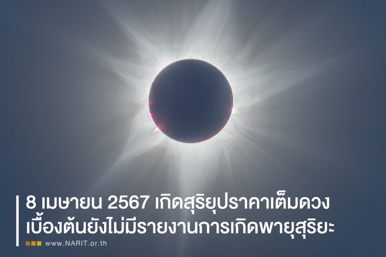 เมื่อวันที่ 8 เม.ย.67 เพจเฟซบุ๊ก "NARIT สถาบันวิจัยดาราศาสตร์แห่งชาติ" ได้โพสต์รูป พร้อมข้อความระบุว่า วันที่ 8 เมษายนนี้ เตรียมพบกับ #สุริยุปราคาเต็มดวง และยังไม่มีรายงานถึงพายุสุริยะในวันดังกล่าว