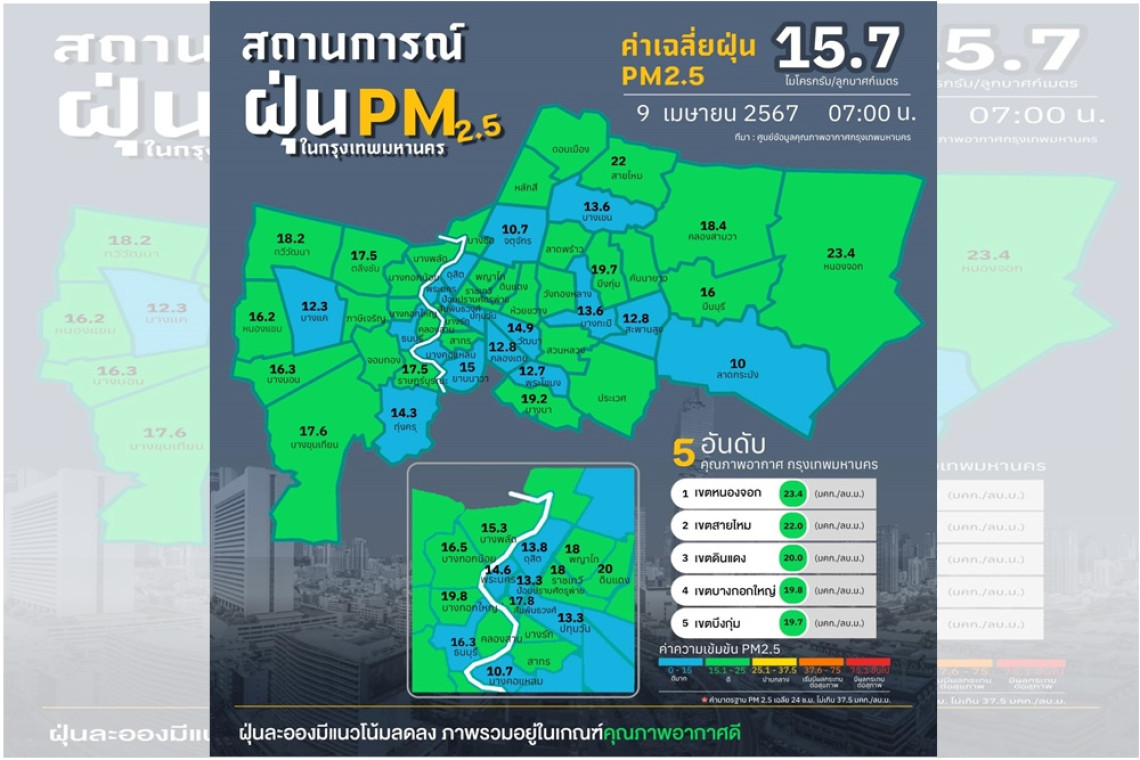ศูนย์ข้อมูลคุณภาพอากาศกรุงเทพมหานคร ขอรายงานสถานการณ์ฝุ่นละอองขนาดไม่เกิน 2.5 ไมครอน (PM 2.5) ในกรุงเทพมหานคร ประจำวันที่ 9 เมษายน 2567 เวลา 07:00 น.