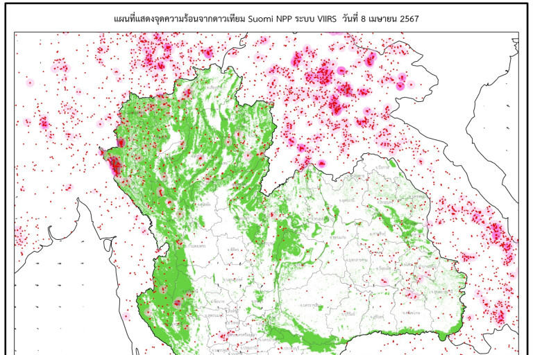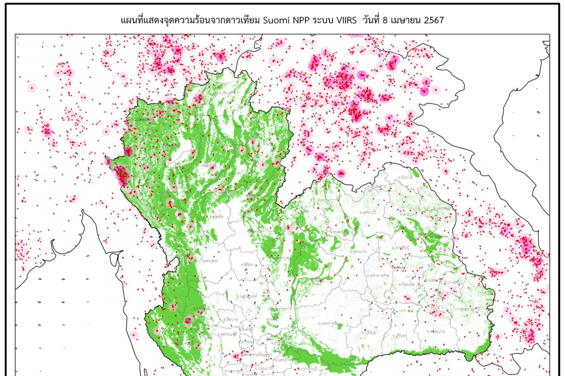 กระทรวงการอุดมศึกษา วิทยาศาสตร์ วิจัยและนวัตกรรม (อว.) โดยสำนักงานพัฒนาเทคโนโลยีอวกาศและภูมิสารสนเทศ (องค์การมหาชน) หรือ GISTDA เผยข้อมูลจากดาวเทียมซูโอมิ เอ็นพีพี (Suomi NPP) และจากดาวเทียมอีกหลายดวง เมื่อวันที่ 8 เมษายน 2567 ไทยพบจุดความร้อนทั้งประเทศ 1,498 จุด ข้อมูลจากดาวเทียมยังระบุอีกว่าจุดความร้อนที่เกิดขึ้นส่วนใหญ่พบในพื้นที่ป่าอนุรักษ์ 674 จุด ตามด้วยพื้นที่ป่าสงวนแห่งชาติ 402 จุด พื้นที่เกษตร 245 จุด สปก. 101 จุด แหล่งชุมชนและอื่นๆ 68 จุด พื้นที่ และพื้นที่ริมทางหลวง 8 จุด สำหรับจังหวัดที่พบจำนวนจุดความร้อนมากที่สุด คือ #แม่ฮ่องสอน 297 จุด ตามด้วย #เชียงใหม่ 207 จุด และ #กาญจนบุรี 90 จุด
