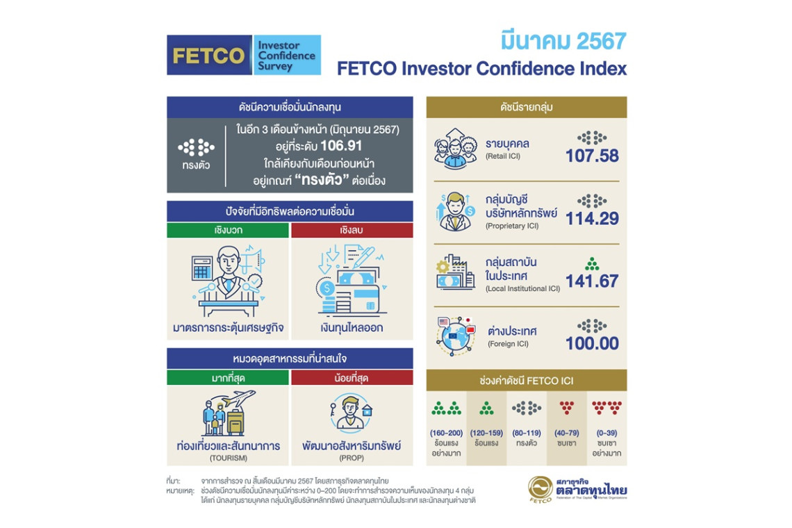นายกอบศักดิ์ ภูตระกูล ประธานกรรมการสภาธุรกิจตลาดทุนไทย เปิดเผยดัชนีความเชื่อมั่นนักลงทุน (FETCO Investor Confidence Index) ผลสำรวจในเดือนมีนาคม 2567 (สำรวจระหว่างวันที่ 20–31 มีนาคม 2567) พบว่า “ดัชนีความเชื่อมั่นนักลงทุน (FETCO Investor Confidence Index: ICI) ในอีก 3 เดือนข้างหน้าอยู่ที่ระดับ 106.91 ใกล้เคียงกับเดือนก่อนหน้า โดยยังคงอยู่ในเกณฑ์ “ทรงตัว” นักลงทุนมองว่ามาตรการกระตุ้นเศรษฐกิจของภาครัฐ เป็นปัจจัยหนุนความเชื่อมั่นมากที่สุด รองลงมาคือการฟื้นตัวของเศรษฐกิจในประเทศและคาดหวังเงินทุนไหลเข้า ในขณะที่ปัจจัยที่ฉุดความเชื่อมั่นนักลงทุนมากที่สุด ได้แก่ การไหลออกของเงินทุน รองลงมาคือนโยบายคงอัตราดอกเบี้ยของธนาคารกลางสหรัฐฯ (FED) และสถานการณ์ความขัดแย้งระหว่างประเทศ