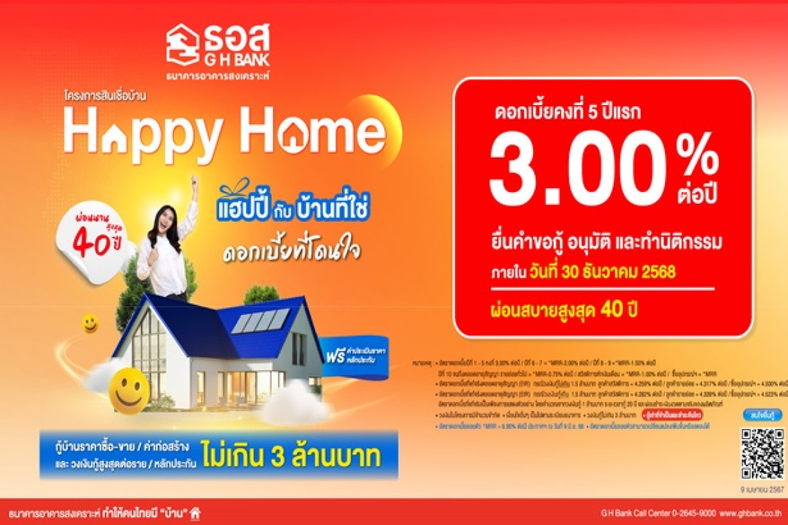 นายกมลภพ วีระพละ กรรมการผู้จัดการ ธนาคารอาคารสงเคราะห์ (ธอส.) เปิดเผยว่า ที่ประชุมคณะรัฐมนตรี (ครม.) มีมติเห็นชอบตามที่กระทรวงการคลังเสนอ ให้ ธอส. จัดทำ “โครงการสินเชื่อบ้าน Happy Home” กรอบวงเงิน 20,000 ล้านบาท สำหรับผู้ที่ต้องการซื้อบ้าน ห้องชุด (คอนโดมิเนียม) ปลูกสร้าง และเพื่อซื้ออุปกรณ์หรือสิ่งอำนวยความสะดวกที่เกี่ยวเนื่องกับที่อยู่อาศัย (ตามเงื่อนไขที่ธนาคารกำหนด) ในระดับราคาไม่เกิน 3 ล้านบาท อัตราดอกเบี้ยคงที่ 5 ปีแรก เท่ากับ 3.00% ต่อปี ปีที่ 6-7 เท่ากับ MRR-2.00% ต่อปี ปีที่ 8-9 เท่ากับ MRR-1.50% ต่อปี ปีที่ 10 จนถึงตลอดอายุสัญญา กรณีลูกค้ารายย่อยเท่ากับ MRR-0.75% ต่อปี ลูกค้าสวัสดิการเท่ากับ MRR-1.00% ต่อปี และอัตราดอกเบี้ยสำหรับซื้ออุปกรณ์ฯ เท่ากับ MRR (อัตราดอกเบี้ย MRR ของ ธอส. ปัจจุบันอยู่ที่ 6.90% ต่อปี) พิเศษ!! ฟรีค่าประเมินราคาหลักประกัน (1,900 – 2,300 บาท)