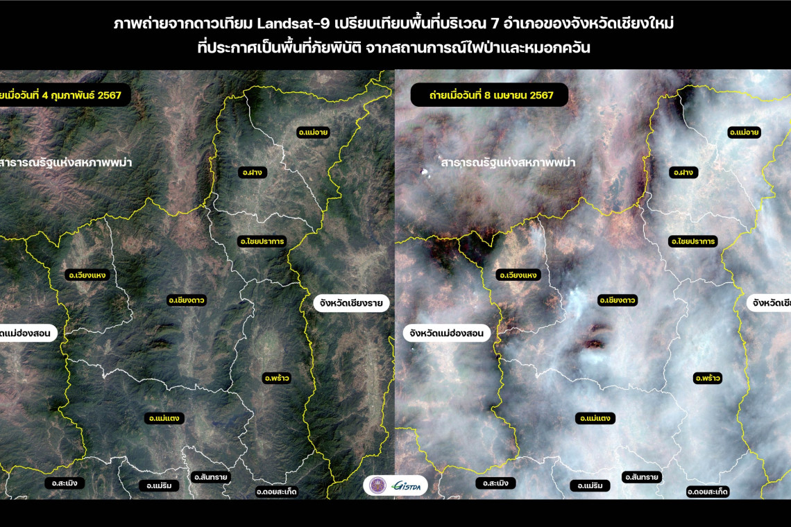 กระทรวงการอุดมศึกษา วิทยาศาสตร์ วิจัยและนวัตกรรม (อว.) โดยสำนักงานพัฒนาเทคโนโลยีอวกาศและภูมิสารสนเทศ (องค์การมหาชน) หรือ GISTDA เผยข้อมูลจากภาพถ่ายดาวเทียม Landsat-9 เปรียบเทียบพื้นที่ทั้ง 7 อำเภอของจังหวัดเชียงใหม่ของวันที่ 4 กุมภาพันธ์ 2567 (ภาพซ้าย) และวันที่ 8 เมษายน 2567 (ภาพขวา) จากภาพแสดงให้เห็นถึงกลุ่มควันที่ปกคลุมอยู่โดยรอบของแต่ละอำเภอในพื้นที่จังหวัดเชียงใหม่ คือ #เชียงดาว #เวียงแหง #แม่แตง #แม่อาย #ฝาง #ไชยปราการ #พร้าว ซึ่งอาจเป็นผลที่ทำให้ค่าฝุ่นของในแต่ละพื้นที่สูงอย่างต่อเนื่องรวมถึงพื้นที่ใกล้เคียงด้วย