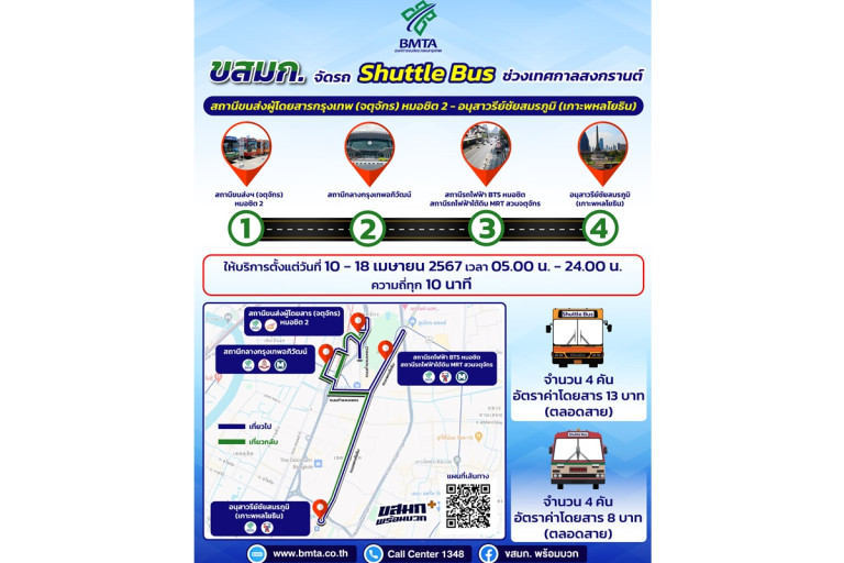 ขสมก. จัดรถ Shuttle Bus เชื่อมต่อหมอชิต 2 - อนุสาวรีย์ชัยสมรภูมิ ระหว่างวันที่ 10 - 18 เมษายน 2567 อำนวยความสะดวกประชาชน