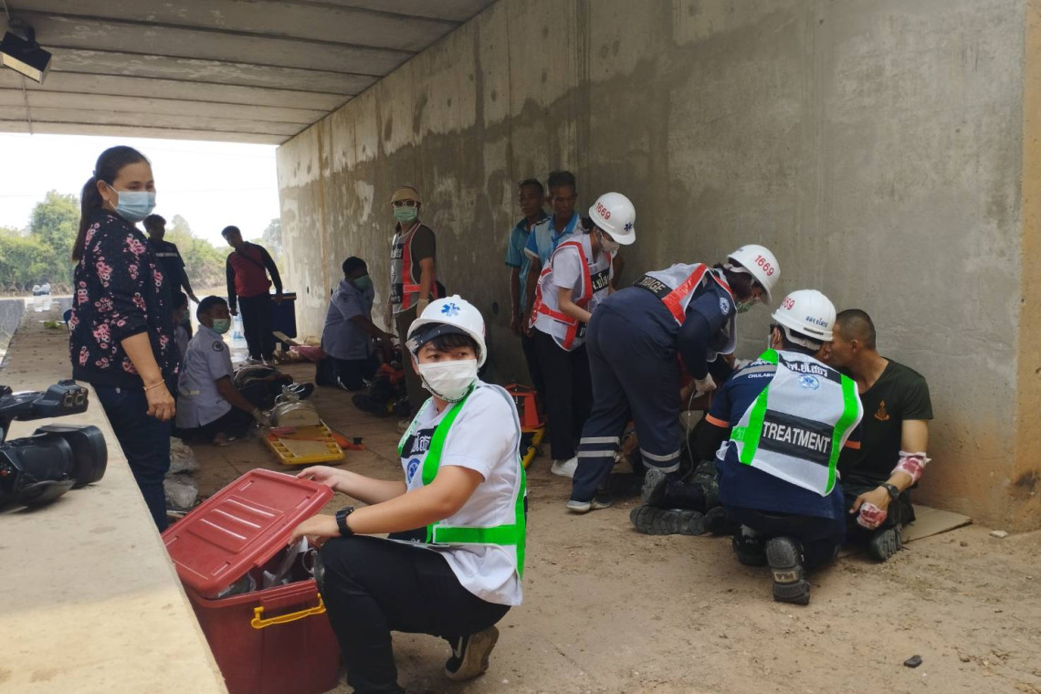 วันที่ 10 เม.ย.67 ที่ถนนอรุณประเสริฐ ตำบลตาดทอง อำเภอเมืองยโสธร จังหวัดยโสธรช่วงสะพานข้ามลำห้วยถ่มระหว่างบ้านหนอกแฝกไปบ้านสะเดา ตำบลตาดทอง รพ.ยโสธรได้บูรณาการร่วมกับหน่วยงานปภ.ยโสธร ตร.สภ.เมืองยโสธรพร้อมเจ้าหน้าที่กู้ชีพกู้ภัยได้ร่วมกันฝึกการช่วยเหลือประชาชนที่ประสบอุบัติเหตุโดยจำลองเหตุการณ์รถสองแถวป่าติ้ว-ยโสธร เสียหลักจากเลนซ้ายชนรถจักยานยนต์เลนขวารถสองแถวและรถจักยานยนต์ตกลงตรงช่องระหว่างสะพาน รถสองแถวพลิกคว่ำและประชาชนได้รับบาดเจ็บรวมจำนวน 23 รายและมีคนติดอยู่ในรถเจ้าหน้าที่ได้เข้าทำการช่วยเหลือผู้บาดเจ็บทั้งหมดโดยแบ่งเป็นชุดทั้งตรวจอาการเบื้องต้นของผู้ประสบเหตุแล้วให้เจ้าหน้าที่ลำเลียงผู้บาดเจ็บมาไว้ที่จุดคัดกรองผู้บาดเจ็บและลำเลียงผู้บาดเจ็บส่ง รพ.ยโสธรทำการรักษาต่อไป