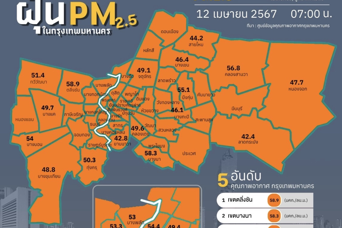 ศูนย์ข้อมูลคุณภาพอากาศกรุงเทพมหานครรายงานผลการตรวจวัด PM2.5 วันที่ 12 เม.ย. 2567 เวลา 05.00-07.00 น. (3 ชั่วโมงล่าสุด) ตรวจวัดได้ 37.1-56.3 มคก./ลบ.ม. ค่าเฉลี่ยของกรุงเทพมหานคร 46.8 มคก./ลบ.ม. ค่า PM2.5 มีแนวโน้มลดลง เกินมาตรฐานอยู่ในระดับสีส้ม เริ่มมีผลกระทบต่อสุขภาพ จำนวน 34 พื้นที่