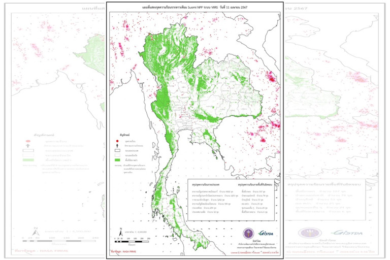 กระทรวงการอุดมศึกษา วิทยาศาสตร์ วิจัยและนวัตกรรม (อว.) โดยสำนักงานพัฒนาเทคโนโลยีอวกาศและภูมิสารสนเทศ (องค์การมหาชน) หรือ GISTDA เผยข้อมูลจากดาวเทียมซูโอมิ เอ็นพีพี (Suomi NPP) และจากดาวเทียมอีกหลายดวง เมื่อวันที่ 11 เมษายน 2567 ไทยพบจุดความร้อนทั้งประเทศ 294 จุด ข้อมูลจากดาวเทียมยังระบุอีกว่าจุดความร้อนที่เกิดขึ้นส่วนใหญ่พบในพื้นที่เกษตร 107 จุด ตามด้วยพื้นที่ป่าสงวนแห่งชาติ 79 จุด พื้นที่ป่าอนุรักษ์ 53 จุด สปก. 25 จุด แหล่งชุมชนและอื่นๆ 24 จุด พื้นที่ และพื้นที่ริมทางหลวง 6 จุด สำหรับจังหวัดที่พบจำนวนจุดความร้อนมากที่สุด คือ #แม่ฮ่องสอน 38 จุด