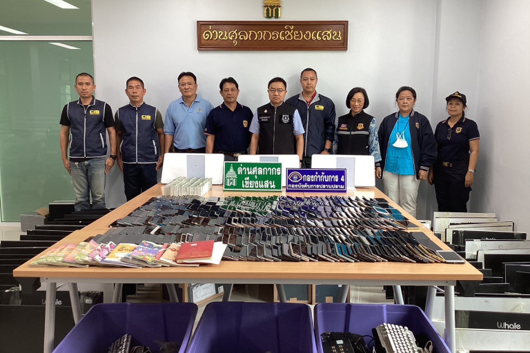 นอกจากนี้ ในพื้นที่บริเวณตลิ่ง ริมแม่น้ำโขง อ.เชียงแสน ยังพบถุงพลาสติก 1 ถุงใหญ่ ซุกซ่อนในป่าทึบ ภายในถุงบรรจุกล่องโทรศัพท์ จำนวน 5 กล่อง ซึ่งตรวจสอบภายในกล่องโทรศัพท์แต่ละกล่อง พบโทรศัพท์มือถือใส่ซิมการ์ด , สมุดบัญชีธนาคาร , บัตร ATM พร้อมกระดาษจดรหัสบัตร ATM และ รหัสการเข้าใช้งานแอปพลิเคชันธนาคาร พร้อมใช้งาน