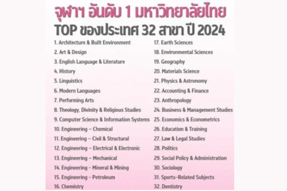 โดย จุฬาลงกรณ์มหาวิทยาลัยครองอันดับ 1 ของไทยใน 32 สาขา จากกลุ่มสาขาต่างๆ มีรายละเอียดดังนี้