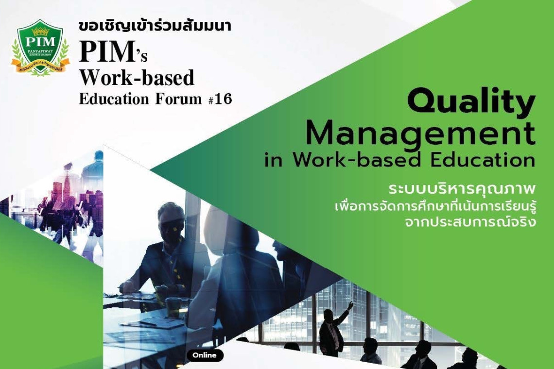 สถาบันการจัดการปัญญาภิวัฒน์ (พีไอเอ็ม) ขอเชิญทุกท่านร่วม งานสัมมนาในหัวข้อ PIM's Work-based Education Forum ครั้งที่ 16 หัวข้อ “Quality Management in Work-based Education : ระบบบริหารคุณภาพ เพื่อการจัดการศึกษาที่เน้นการเรียนรู้จากประสบการณ์จริง” วันที่ 22 เมษายน 2567 เวลา 13.00 – 16.00 น. เพื่อแลกเปลี่ยนเรียนรู้ด้านการบริหารคุณภาพที่สอดคล้องกับแนวทางการจัดการเรียนการสอนที่เน้นการเรียนรู้จากประสบการณ์จริง โดยได้รับเกียรติจาก รองศาสตราจารย์ ดร.สมภพ มานะรังสรรค์ อธิการบดี พีไอเอ็ม บรรยายพิเศษ หัวข้อ "PIM Work-based Education : การปรับตัวของอุดมศึกษาให้ทันต่อการเปลี่ยนแปลง" พร้อมคณะผู้บริหาร คณาจารย์ พีไอเอ็ม ผู้ช่วยศาสตราจารย์ ดร.เลิศชัย สุธรรมานนท์ รองอธิการบดี ส่วนพัฒนางานบริการวิชาการและองค์กร บรรยาย หัวข้อ "ระบบบริหารคุณภาพเพื่อจัดการศึกษาแบบ Work-based Education" และดร.ณัฐวุฒิ ว่องทรัพย์ทวี ผู้อำนวยการสำนักประกันและพัฒนาคุณภาพการศึกษา บรรยายหัวข้อ "ระบบบริหารคุณภาพเพื่อจัดการศึกษาแบบ Work-based Education"