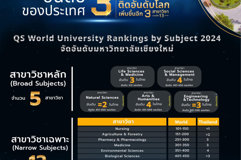 มหาวิทยาลัยเชียงใหม่ติดอันดับโลกในสาขาวิชาเฉพาะ (Narrow Subjects) จำนวน 13 สาขาวิชา จาก 55 สาขาวิชา และสาขาวิชาหลัก (Broad Subjects) ทั้ง 5 สาขาวิชา มากที่สุดเป็นอันดับ 3 ของประเทศ จากการจัดอันดับมหาวิทยาลัยโลกรายสาขาวิชา ประจำปี 2024 โดย QS World University Rankings