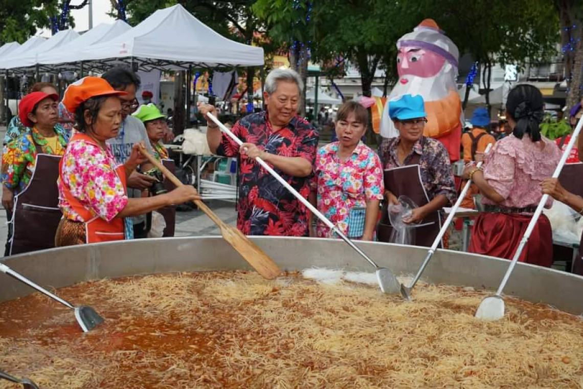 วันที่ 15 เมษายน 2567 เวลา 15.00 น. ที่ลานอนุสาวรีย์ท้าวสุรนารี (ย่าโม) นครราชสีมา  นายประเสริฐ  บุญชัยสุข นายกเทศมนตรีนคร (ทน.) นครราชสีมา เปิดกิจกรรมงานประเพณีสงกรานต์ “ถนนขั่วหมี่โคราช” (ภาษาถิ่น) หรือผัดหมี่ จับตะหลิวขั่วหมี่กระทะยักษ์ขนาดเส้นผ่าศูนย์กลาง 2.5 เมตร ใช้เส้นหมี่ 200 กิโลกรัม