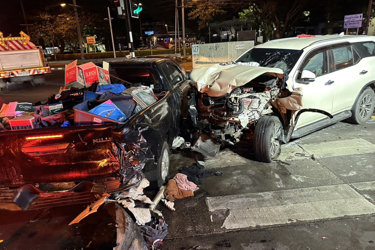 ที่เกิดเหตุอยู่กลางแยกทิศทางมุ่งหน้าอุโมงค์เกษตร พบรถ นั่งส่วนบุคคลชนกับรถกะบะอย่างรุนแรงจำนวน 3 คัน ได้รับความเสียหายหนักทั้ง 3 คัน พบรถ กระบะยี่ห้อโตโยต้าวีโก้สีบรอนซ์ หมายเลขทะเบียน 1 ฒณ xxxx กรุงเทพมหานคร ถูกชนท้ายได้รับ ได้รับความเสียหายหนักกระจกบานหลังแตกยางอะไหล่หลุดออก ใกล้กันพบรถยี่ห้อโตโยต้าวีโว่สีดำหมายเลขทะเบียน 3 ฒศ xxxx กรุงเทพมหานครจอดขวางถนนอยู่ถูก ชนด้านข้างได้รับความเสียหาย และยังพบรถนั่งส่วนบุคคล ยี่ห้อโตโยต้ารุ่น ฟอร์จูนเนอร์ สีขาวหมายเลขทะเบียน 6 กฌ xxxx กรุงเทพมหานคร สภาพรถด้านหน้ามีรอยชนอย่างหนักยับเยินฝากระโปรงหน้ายุบ กันชนหน้ารถหลุด กระจกบานหน้าแตกยางหน้า ฝั่งซ้ายแตกถุงลมนิรภัย ภายในรถแตกรอบคัน ไม่สามารถขับเคลื่อนได้