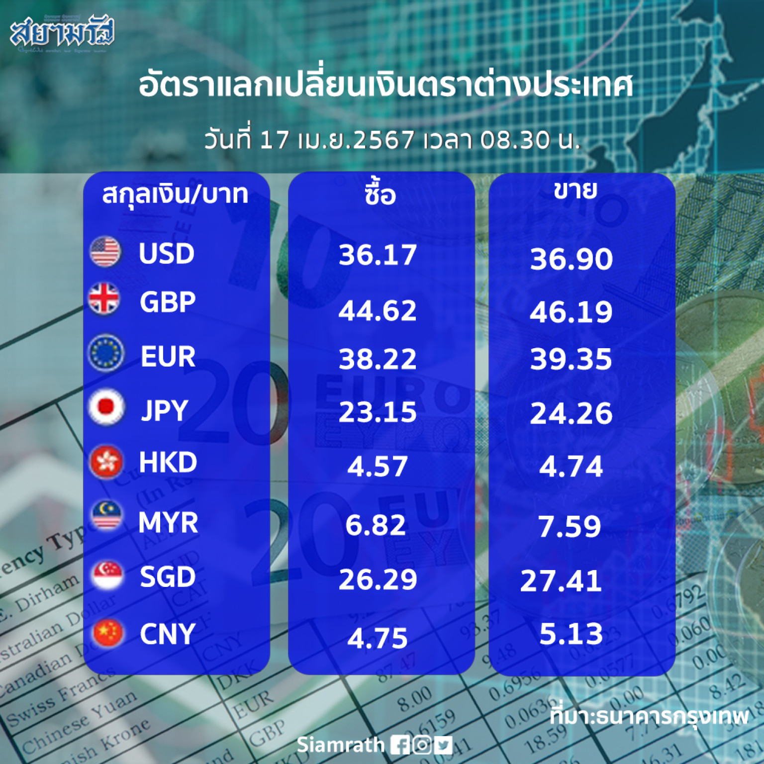 17 เมษายน 2567 08:53 น. สยามรัฐออนไลน์ เศรษฐกิจ ผู้สื่อข่าวรายงานอัตราแลกเปลี่ยนเงินตราต่างประเทศ ประจำวันที่ 17เม.ย.67 ว่า อัตราแลกเปลี่ยนเงินบาทเป็นสกุลเงินตราต่างๆ ณ เวลา 08.30 น. (ตามตารางประกอบข้างล่าง) โดยเงินดอลลาร์สหรัฐรับซื้อ 36.17 บาทต่อดอลลาร์สหรัฐ ขายออก 36.90 บาทต่อดอลลาร์สหรัฐ