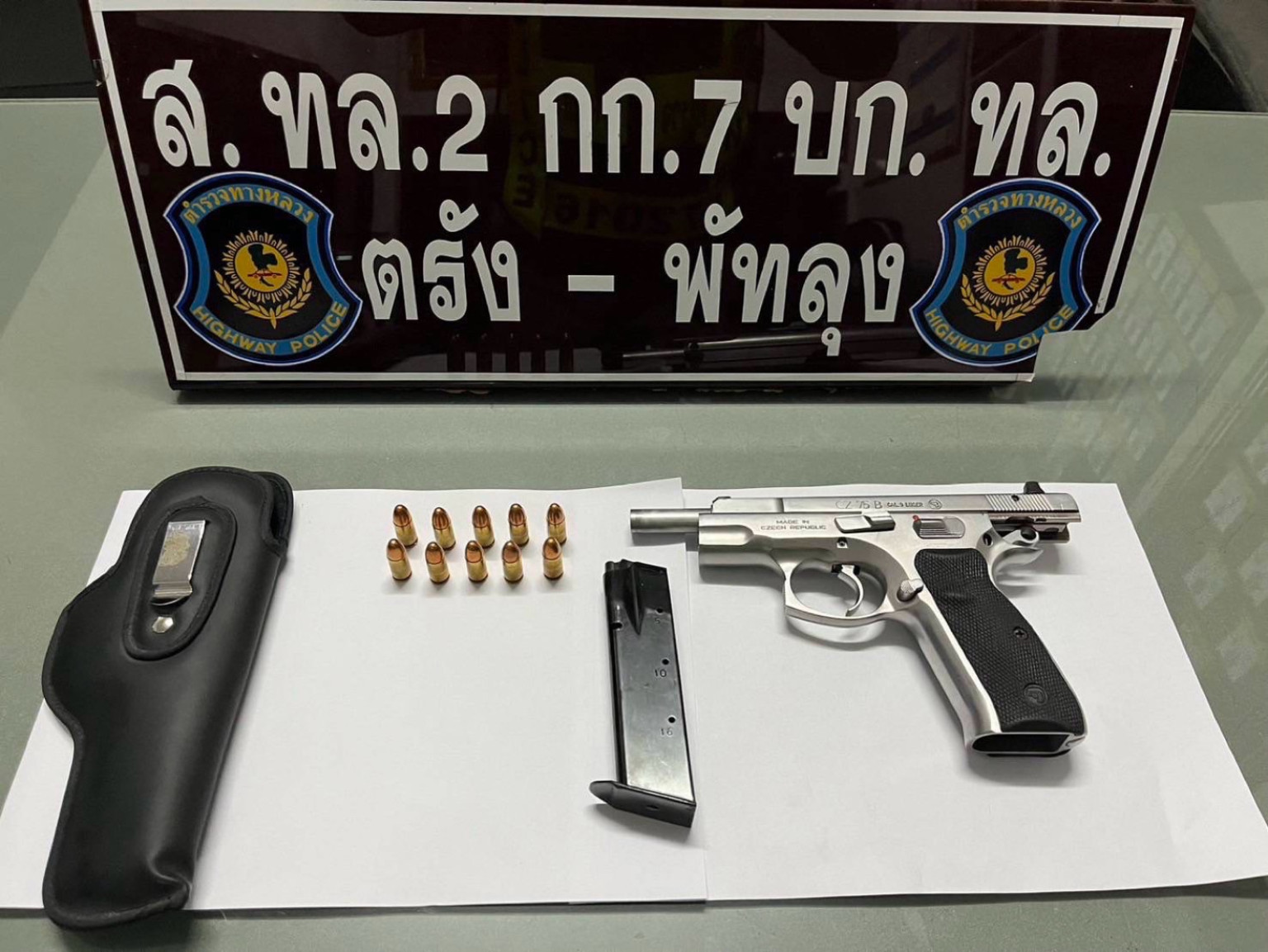 ผลการตรวจค้นภายในรถ พบอาวุธปืนพกสั้น ชนิดกึ่งอัตโนมัติ ขนาด 9 มม. จำนวน 1 กระบอก พร้อมกระสุนปืนขนาด 9 มม.จำนวน 10 นัด เจ้าหน้าที่ตำรวจจึงเเจ้งข้อกล่าวหาและควบคุมตัวผู้ต้องหามาทำบันทึกจับกุม ก่อนนำตัวพร้อมของกลางส่ง พนักงานสอบสวน สภ.นาขยาด จ.พัทลุง เพื่อดำเนินคดีตามกฎหมาย