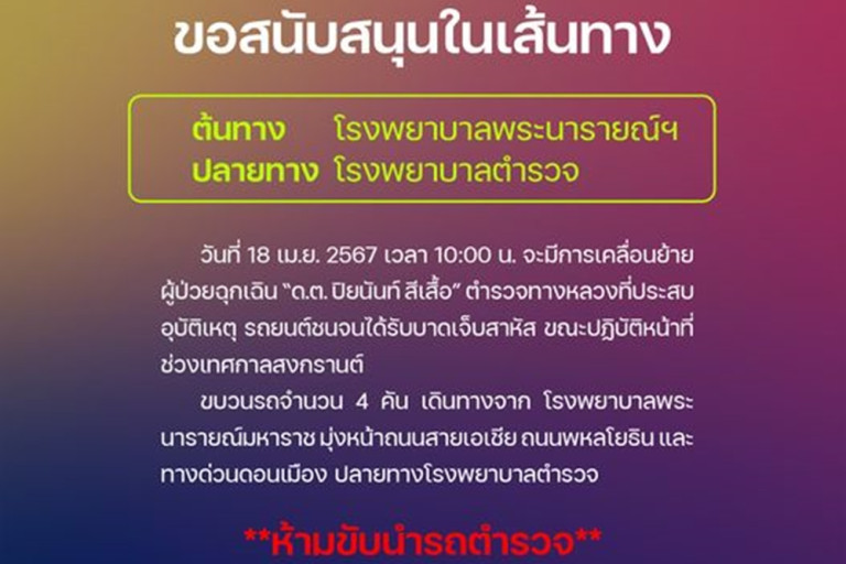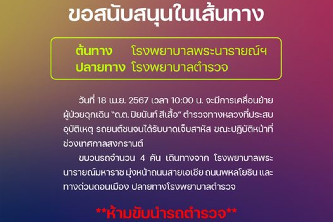 ขอสนับสนุนในเส้นทาง เคลื่อนย้ายผู้ป่วยฉุกเฉิน วันที่ 18 เม.ย. 2567 เวลา 10:00 น. ขบวนรถจำนวน 4 คัน** เดินทางจากโรงพยาบาลพระนารายณ์มหาราช มุ่งหน้าถนนสายเอเชีย ถนนพหลโยธิน และทางด่วนดอนเมือง ปลายทางโรงพยาบาลตำรวจ