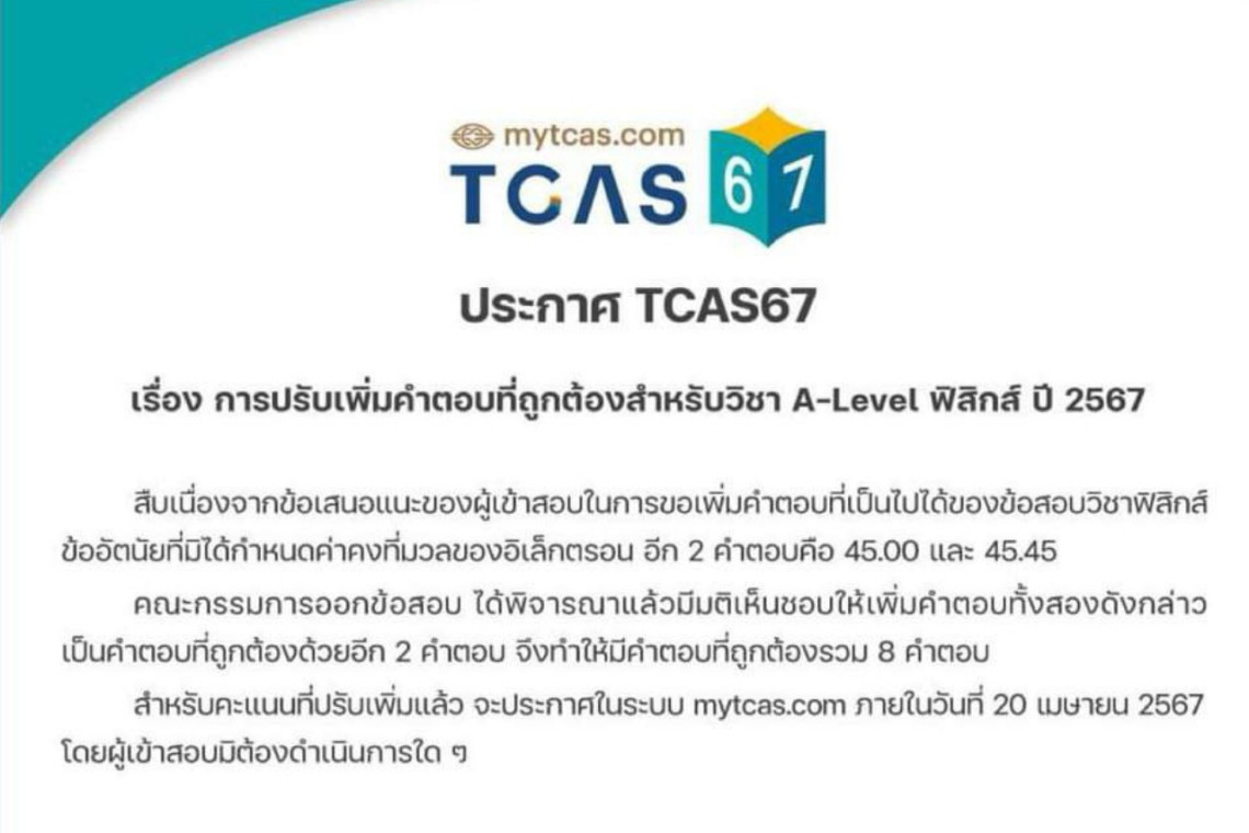 ล่าสุดในวันนี้ 19 เมษายน 67 มีประกาศเพิ่มเติมในข้อสอบฟิสิกส์ ว่ามีการปรับให้มีข้อสอบที่ถูกต้อง 8 คำตอบแล้ว