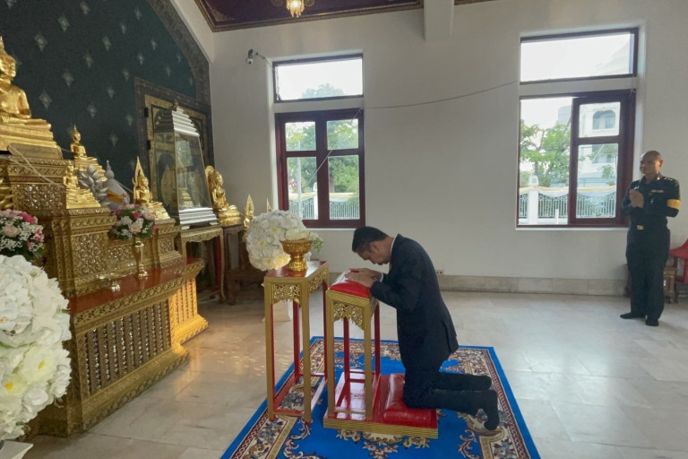 เมื่อนายสุทิน เดินทางมาถึงได้เข้าสักการะพระพุทธรูปบนหอพระพุทธรูปถวายพวงมาลัยและใส่บาตรพระประจำวันเกิด พร้อมสักการะองค์พระหลักเมืองภายในอาคารศาลหลักเมืองถวายผ้าตาด และถวายพวงมาลัย