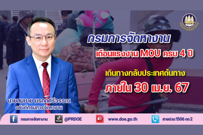 นายสมชาย มรกตศรีวรรณ อธิบดีกรมการจัดหางาน เปิดเผยว่า แรงงาน 3 สัญชาติ กัมพูชา ลาว และเมียนมา ที่เข้ามาทำงานตามบันทึกความเข้าใจว่าด้วยความร่วมมือด้านแรงงาน (MOU) จะได้รับอนุญาตทำงาน 2 ปี ต่ออายุได้อีกไม่เกิน 2 ปี และเมื่อครบกำหนดระยะเวลา 4 ปีแล้วต้องเดินทางกลับประเทศต้นทาง กรมการจัดหางานจึงขอประชาสัมพันธ์ให้พี่น้องแรงงาน 3 สัญชาติ ที่เข้ามาทำงานตามระบบ MOU ซึ่งวาระการจ้างงานครบ 4 ปี ระหว่างวันที่ 1 พฤศจิกายน 2563 - 31 ธันวาคม 2566เดินทางกลับประเทศต้นทางภายในวันที่ 30 เมษายน 2567  (มติครม. 3 ต.ค. 66 ในส่วน MOU ครบ 4 ปีขึ้นไป) รวมถึงแรงงานที่เข้ามาทำงานตาม MOU ซึ่งวาระการจ้างงานครบ 4 ปี ตั้งแต่วันที่ 1 มกราคม 2567 เป็นต้นไป ต้องเดินทางกลับประเทศต้นทาง ก่อนที่การอนุญาตให้อยู่ในราชอาณาจักรเป็นการชั่วคราวสิ้นสุด (วีซ่าหมดอายุ) หากอยู่เกินกำหนดอนุญาตให้อยู่ในราชอาณาจักร (over stay) จะมีความผิดตามกฎหมายคนเข้าเมือง โดยนายจ้าง/ผู้ประกอบการสามารถยื่นคำร้องขอนำคนต่างด้าวมาทำงานกับนายจ้างในประเทศ (นจ. 2) ได้ล่วงหน้า หากประสงค์จะนำแรงงานดังกล่าวกลับเข้ามาทำอีกครั้ง เพื่อลดระยะเวลาดำเนินการ ณ ประเทศต้นทาง