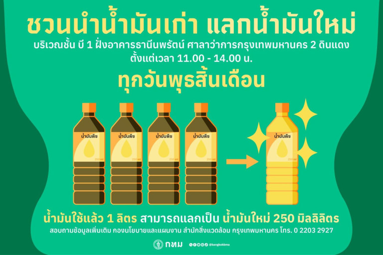เมื่อวันที่ 21 เม.ย.67 กรุงเทพมหานคร (กทม.) ขอเชิญชวนผู้ประกอบการร้านอาหาร ร่วมรักษาสิ่งแวดล้อม โดยการนำน้ำมันจากการประกอบอาหารที่ใช้แล้ว มาแลกเป็นน้ำมันขวดใหม่ฟรี ในกิจกรรม "น้ำมันใช้แล้ว แลกน้ำมันใหม่" ทุกวันพุธ สิ้นเดือน บริเวณชั้น บี 1 ฝั่งอาคารธานีนพรัตน์ ศาลาว่าการกรุงเทพมหานคร 2 เขตดินแดง เวลา 11.00 – 14.00 น.