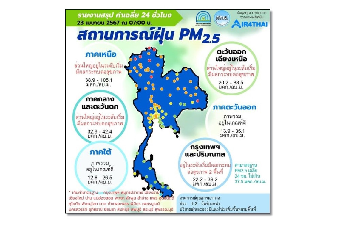 ศูนย์สื่อสารการแก้ไขปัญหามลพิษทางอากาศ รายงานการติดตามตรวจสอบคุณภาพอากาศ ประจำ วันที่ 23 เมษายน 2567 ณ 07:00 น. สรุปดังนี้ ภาพรวมปริมาณ PM2.5 ในประเทศพบเกินค่ามาตรฐานในกรุงเทพฯ จ.สมุทรปราการ จ.เชียงราย จ.เชียงใหม่ จ.น่าน จ.แม่ฮ่องสอน จ.พะเยา จ.ลำพูน จ.ลำปาง จ.แพร่ จ.อุตรดิตถ์ จ.สุโขทัย จ.พิษณุโลก จ.ตาก จ.กำแพงเพชร จ.พิจิตร จ.เพชรบูรณ์ จ.นครสวรรค์ จ.อุทัยธานี จ.ชัยนาท จ.สิงห์บุรี จ.ลพบุรี จ.สระบุรี จ.สุพรรณบุรี จ.กาญจนบุรี จ.ราชบุรี จ.บึงกาฬ จ.เลย จ.อุดรธานี จ.หนองบัวลำภู จ.สกลนคร จ.มุกดาหาร จ.ขอนแก่น จ.กาฬสินธุ์ จ.ร้อยเอ็ด จ.อำนาจเจริญ จ.ชัยภูมิ จ.ยโสธร และ จ. อุบลราชธานี