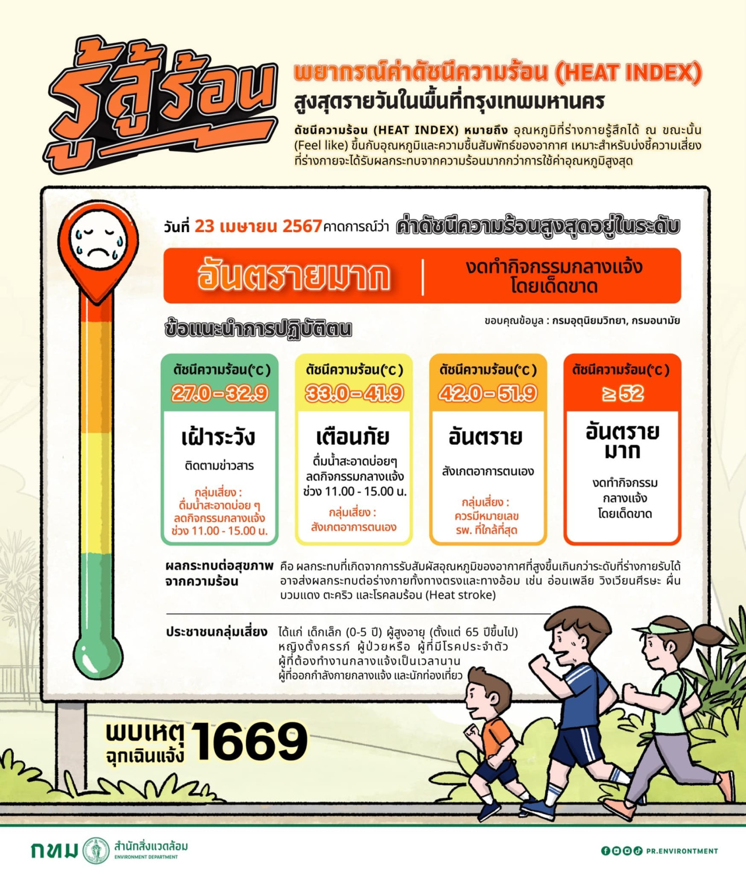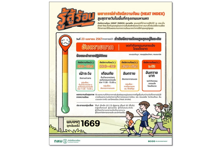 23 เมษายน 2567 10:32 น. สยามรัฐออนไลน์ คุณภาพชีวิต วันที่ 23 เม.ย.67 สำนักสิ่งแวดล้อม กรุงเทพมหานคร แจ้งว่า ค่าดัชนีความร้อน (Heat Index) อยู่ในเกณฑ์ "อันตรายมาก" ควรงดทำกิจกรรมกลางแจ้งโดยเด็ดขาด