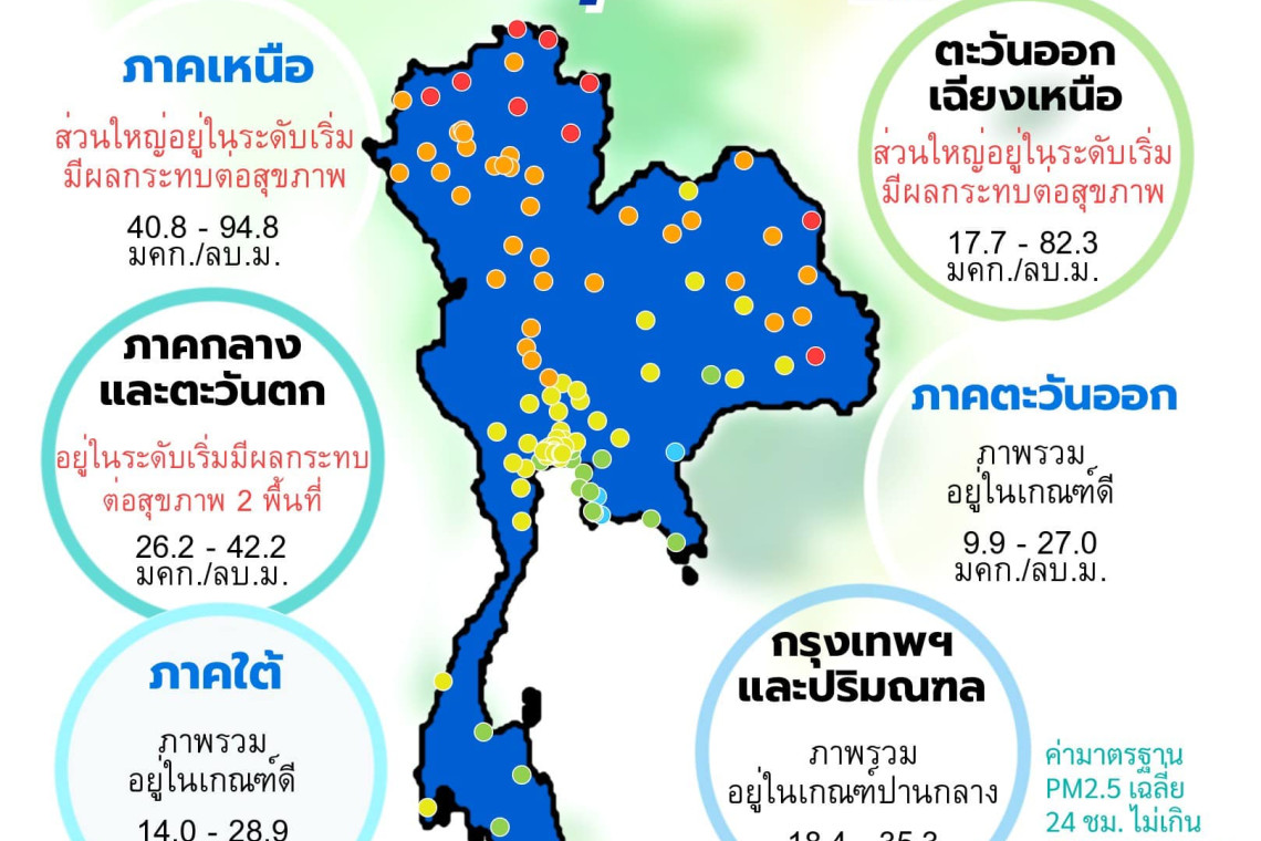 ภาพรวมปริมาณ PM2.5 ในประเทศพบเกินค่ามาตรฐานใน จ.เชียงราย จ.เชียงใหม่ จ.น่าน จ.แม่ฮ่องสอน จ.พะเยา จ.ลำพูน จ.ลำปาง จ.แพร่ จ.อุตรดิตถ์ จ.สุโขทัย จ.พิษณุโลก จ.กำแพงเพชร จ.พิจิตร จ.เพชรบูรณ์ จ.นครสวรรค์ จ.อุทัยธานี จ.ชัยนาท จ.สิงห์บุรี จ.บึงกาฬ จ.เลย จ.อุดรธานี จ.นครพนม จ.หนองบัวลำภู จ.สกลนคร จ.มุกดาหาร จ.กาฬสินธุ์ จ.อำนาจเจริญ จ.ยโสธร และ จ.อุบลราชธานี
