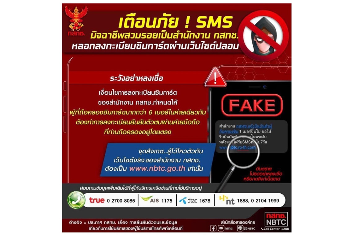 2.เว็บไซต์ลงทะเบียนที่แอบอ้างมาพร้อมกับ SMS นั้น ไม่ใช่เว็บไซต์จริงของสำนักงาน กสทช. โดยเว็บไซต์ที่ถูกต้อง คือ https://www.nbtc.go.th/ และการลงทะเบียนยืนยันตัวตน ผู้ถือครองซิมการ์ดสามารถลงทะเบียนผ่านเครือข่ายซิมการ์ดที่ท่านถือครองได้โดยตรง
