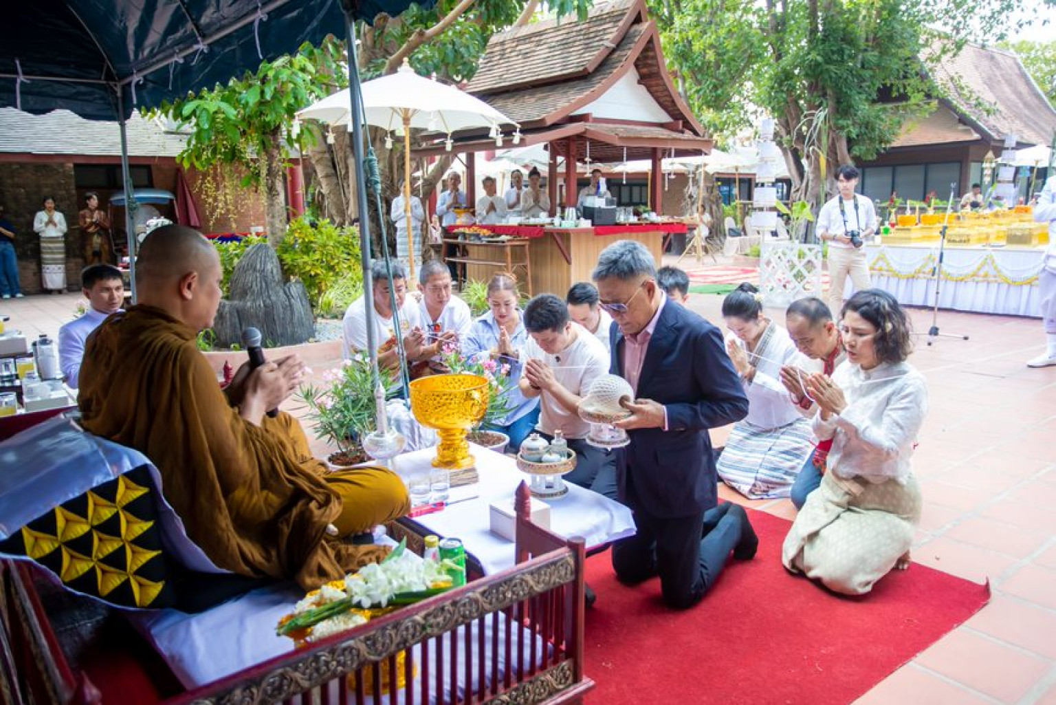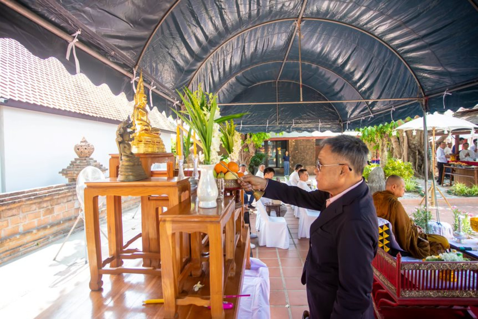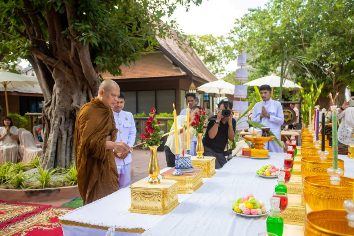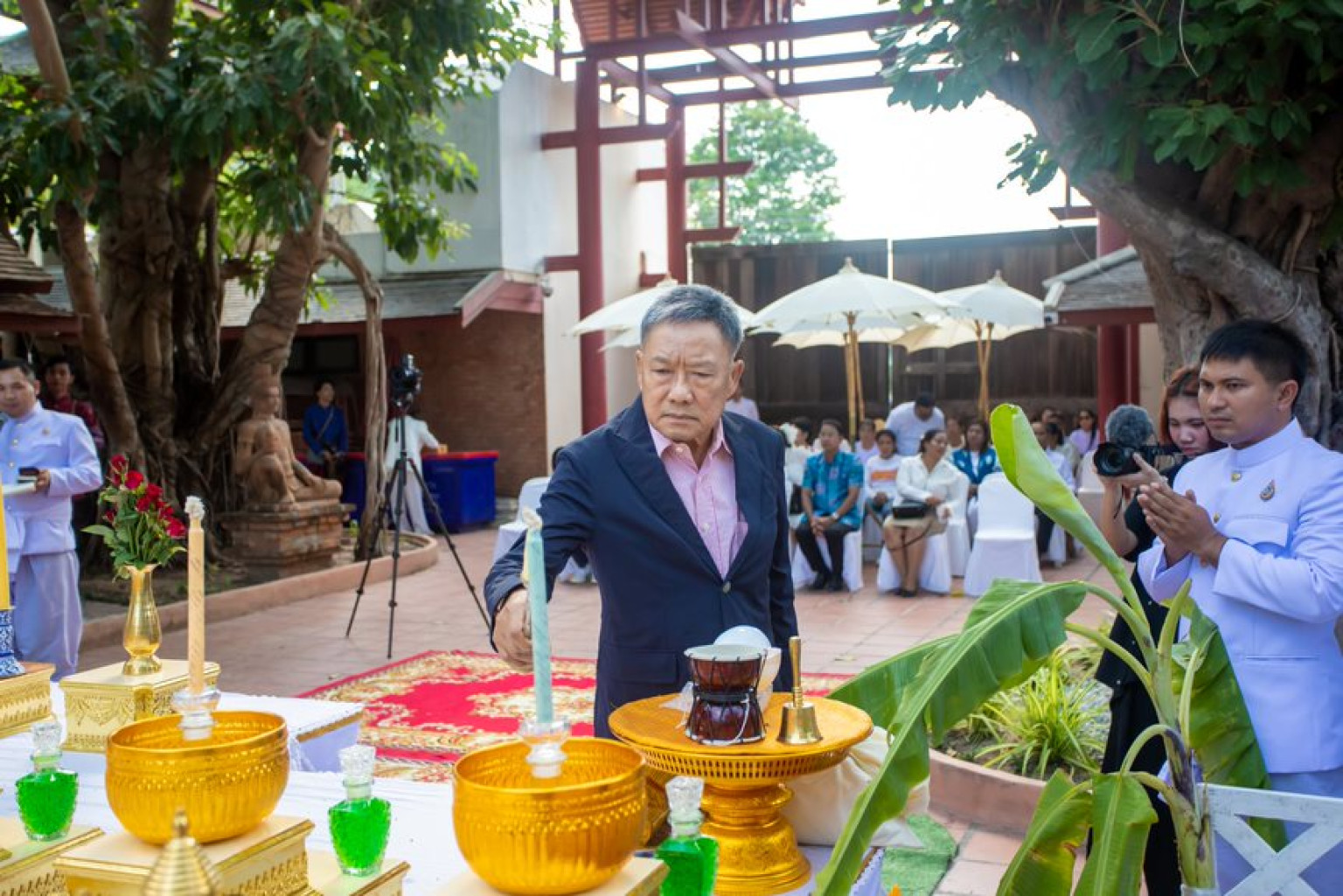 โดยภายในพิธีได้มีเครื่องบวงสรวงชุดใหญ่ โดยใช้พานสีทอง เพื่อความเจริญรุ่งเรืองและเพื่อความเป็นสิริมงคล พร้อมทั้งได้จัดการแสดงกลองสะบัดชัย เอาฤกษ์ เอาชัย จากนั้นทางคณะผู้บริหารไทธานี หมู่บ้านวัฒนธรรมและศิลปะ ได้ร่วมกันทอดผ้าปาสามัคคี เพื่อสมทบทุนสร้างพระนั่งเมืองสูง 168 เมตร ของวัดพุทธวนาราม (วัดป่าวังน้ำเย็น) ตำบลเกิ้ง อำเภอเมือง จังหวัดมหาสารคาม