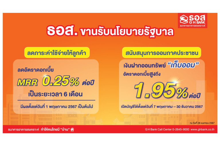 ธอส.ขานรับนโยบายรัฐบาล ลดอัตราดอกเบี้ย MRR 0.25% ต่อปี มีผล 1 พ.ค.67 พร้อมส่งเสริมวินัยการออมด้วย “เงินฝากออมทรัพย์เก็บออม” ดอกเบี้ยสูงถึง 1.95% ต่อปี