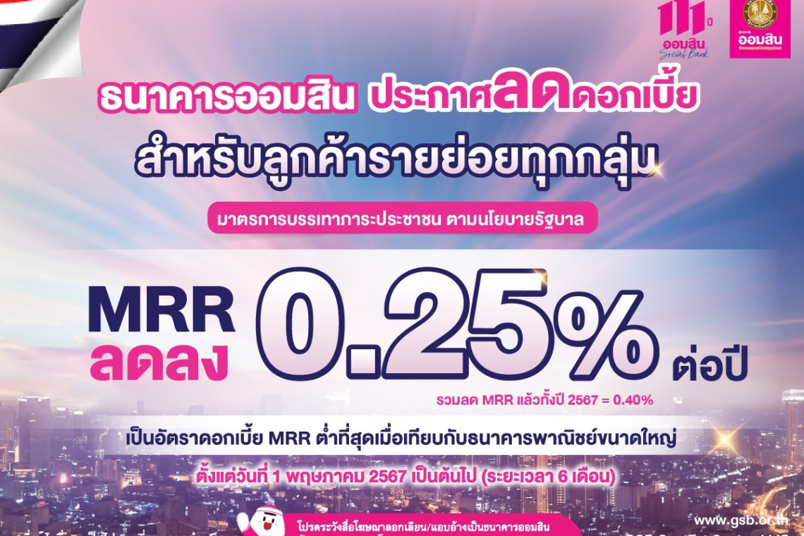ออมสิน ลดดอกเบี้ย MRR 0.25% ช่วยลูกค้ารายย่อยทุกกลุ่ม นาน 6 เดือน มีผล 1 พ.ค. 2567: ออมสิน ได้ประกาศลดอัตราดอกเบี้ย MRR สำหรับลูกค้ารายย่อยทุกกลุ่มลง 0.25% ต่อปี เป็นระยะเวลา 6 เดือน รวมลด MRR แล้วทั้งปี 2567 เท่ากับ 0.40% มีผลตั้งแต่วันที่ 1 พ.ค.67