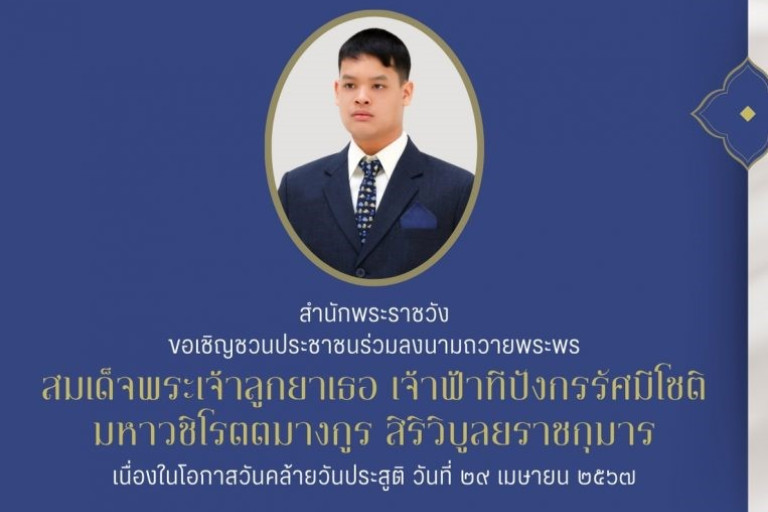 สำนักพระราชวัง ขอเชิญชวนประชาชนร่วมลงนามถวายพระพร สมเด็จพระเจ้าลูกยาเธอ เจ้าฟ้าทีปังกรรัศมีโชติ มหาวชิโรตตมางกูร สิริวิบูลยราชกุมาร เนื่องในโอกาสวันคล้ายวันประสูติ วันที่ 29 เมษายน 2567 ผ่านระบบออนไลน์ ที่เว็บไซต์หน่วยราชการในพระองค์ www.royaloffice.th ระหว่างวันที่ 28 – 30 เมษายน 2567