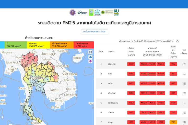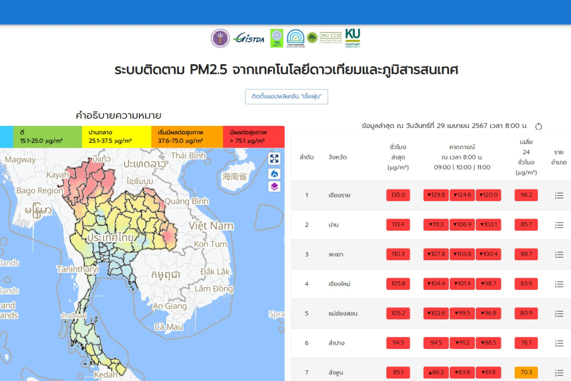 กระทรวงการอุดมศึกษา วิทยาศาสตร์ วิจัยและนวัตกรรม (อว.) โดยสำนักงานพัฒนาเทคโนโลยีอวกาศและภูมิสารสนเทศ (องค์การมหาชน) หรือ GISTDA ร่วมกับสำนักงานการวิจัยแห่งชาติ, กรมควบคุมมลพิษ, มหาวิทยาลัยเกษตรศาสตร์ และมหาวิทยาลัยเชียงใหม่ เกาะติดสถานการณ์ฝุ่น PM 2.5 แบบรายชั่วโมง ด้วยข้อมูลจากดาวเทียมผ่านแอปพลิเคชั่น “เช็คฝุ่น” เมื่อเวลา 08.00 น. ของวันที่ 29 เมษายน 2567 พบ 9 จังหวัด มีค่าฝุ่นเกินเกณฑ์มาตรฐานในระดับสีแดงที่มีผลกระทบต่อสุขภาพและระบบทางเดินหายใจ คือ #เชียงราย 135 ไมโครกรัม #น่าน 113.4 ไมโครกรัม #พะเยา 110.3 ไมโครกรัม #เชียงใหม่ 105.8 ไมโครกรัม #แม่ฮ่องสอน 105.2 ไมโครกรัม #ลำปาง 94.5 ไมโครกรัม #ลำพูน 85.1 ไมโครกรัม #นครพนม 82 ไมโครกรัม #บึงกาฬ 76.3 ไมโครกรัม ส่วนอีก 15 จังหวัดโซนภาคเหนือ และภาคตะวันออกเฉียงเหนือ มีค่าคุณภาพอากาศเกินมาตรฐานในระดับสีส้ม