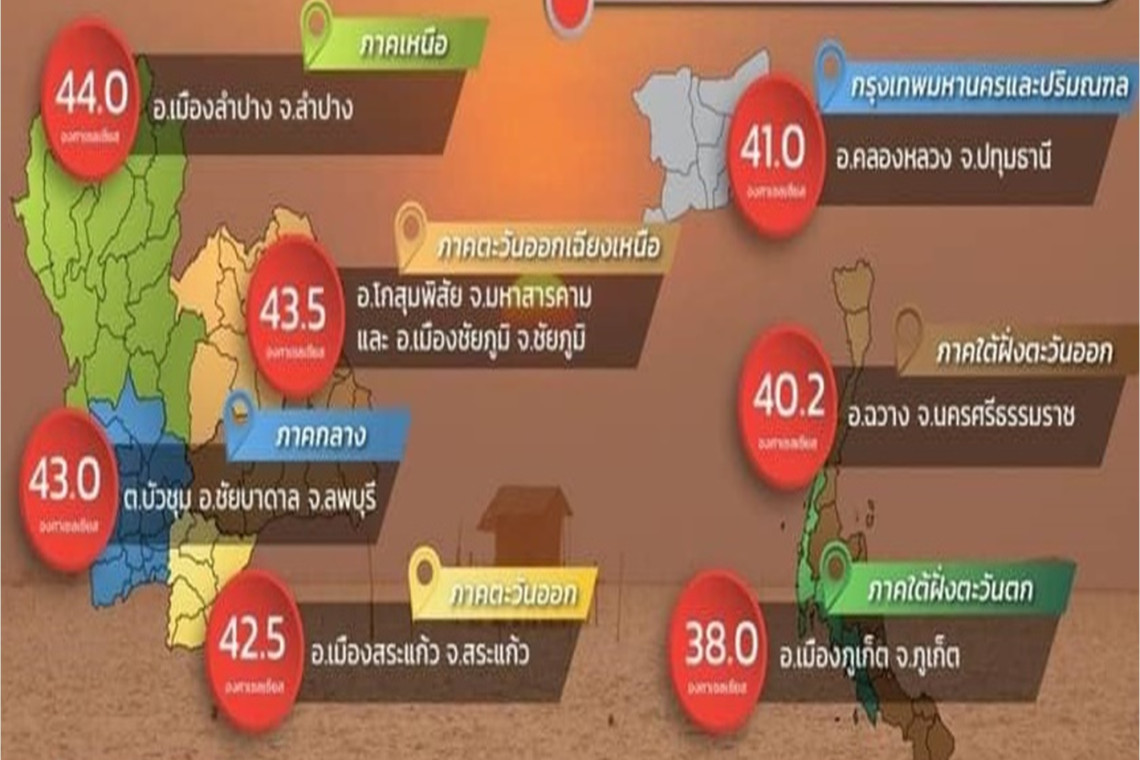 โดยอุณหภูมิสูงสุดของวันนี้คาดแตะ 44 องศาเซลเซียส ดังนี้