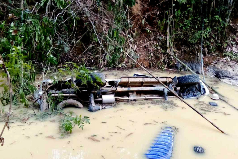 โดยริมถนนด้านขวามือ เป็นเหวลึก ประมาณ 10 เมตร เจ้าหน้าที่พบร่องรอยต้นไม้ขนาดเล็กใหญ่ข้างทางพังราบเป็นแนวยาวลงไป และพบรถยนต์กระบะตอนครึ่ง สีขาว ยี่ห้อโตโยต้าทะเบียนชุมพร สภาพพลิกหงายท้องอยู่ในน้ำ ซึ่งลึกกว่า 3 เมตร ข้างมีแท้งน้ำ ขนาด 2,000 ลิตร และอุปกรณ์ ต่างๆลอยเกลื่อนอยู่ในน้ำ