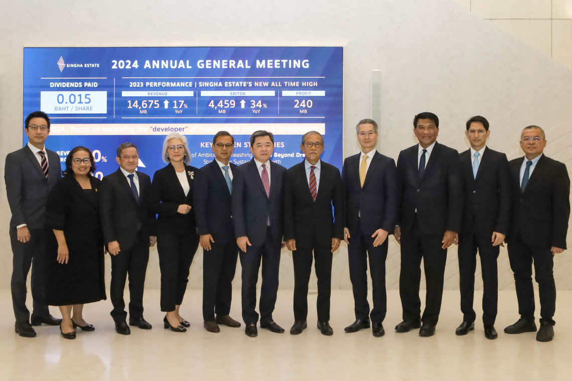 บริษัท สิงห์ เอสเตท จำกัด (มหาชน) หรือ S โดยคุณปีติพงศ์ พึ่งบุญ ณ อยุธยา ประธานกรรมการ และคุณฐิติมา รุ่งขวัญศิริโรจน์ กรรมการและประธานเจ้าหน้าที่บริหาร พร้อมด้วยคณะกรรมการ จัดประชุมผู้ถือหุ้นประจำปี 2567 รายงานผลการดำเนินงานในปี 2566 พร้อมเผยแผนการดำเนินงานและกลยุทธ์ปี 2567 เพื่อมุ่งสู่เป้าหมายในการสร้าง New All-Time High ในด้านรายได้และกำไรในทุกพอร์ตธุรกิจอย่างต่อเนื่อง ผ่านปรัชญา “Go Beyond Dreams”