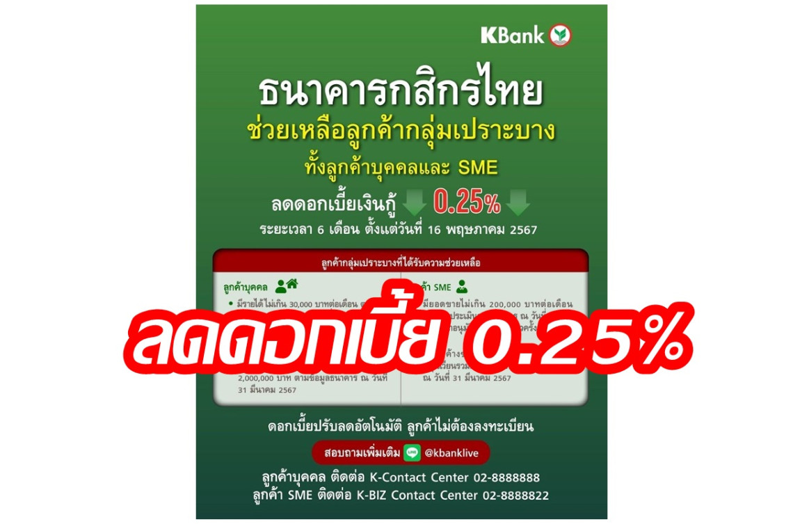 ธนาคารกสิกรไทย (KBANK) ปรับลดดอกเบี้ยช่วยเหลือลูกค้ากลุ่มเปราะบาง 0.25% สำหรับเงินกู้ (Loan) ที่อ้างอิงอัตราดอกเบี้ยลอยตัว เป็นระยะเวลา 6 เดือน ทั้งลูกค้าบุคคลและ SME ตามเงื่อนไขที่ธนาคารกำหนด จำนวนประมาณ 200,000 ราย วงเงินสินเชื่อรวมประมาณ 82,000 ล้านบาท โดยมีผลตั้งแต่วันที่ 16 พฤษภาคม 2567 เพื่อช่วยเหลือลูกค้าในช่วงที่เศรษฐกิจยังฟื้นตัวไม่เต็มที่ ซึ่งลูกค้าจะได้รับการปรับลดดอกเบี้ยแบบอัตโนมัติ โดยไม่ต้องลงทะเบียน