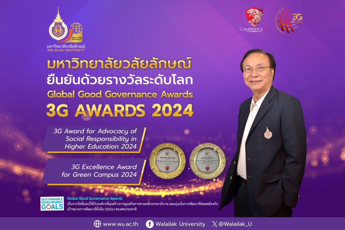 ม.วลัยลักษณ์ คว้า 2 รางวัลเกียรติยศระดับโลก 3G Award 2024 ด้านความโดดเด่นในการรับผิดชอบต่อสังคมตามแนวทางการพัฒนาที่ยั่งยืน (SDGs) ในระดับอุดมศึกษา และรางวัลยอดเยี่ยมด้านมหาวิทยาลัยสีเขียว