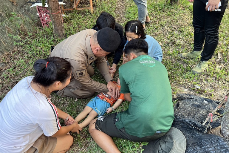 ภาพนาทีชีวิตที่ตำรวจรีบวิ่งไปที่เกิดเหตุเพื่อช่วยเด็กน้อยวัยขวบเศษที่จมน้ำเพื่อทำการ CPR ขณะที่เด็กน้อยหยุดหายใจจนกลับคืนมีชีพจรมาอีกครั้งรอดตายหวุดหวิด เมื่อช่วงเย็นวันที่ 30 เม.ย.67 ที่ผ่านมาจนมีเสียงชื่นชมจากญาติและผู้เห็นเหตุการณ์ที่เจาหน้าที่ตำรวจสามารถเดินทางมาจุดเกิดเหตุอย่างรวดเร็วจนสามารถใช่วิธีการช่วยเหลือผู้ประสบเหตุอย่างถูกวิธีแล้วช่วยชีวิตเอาไว้ได้