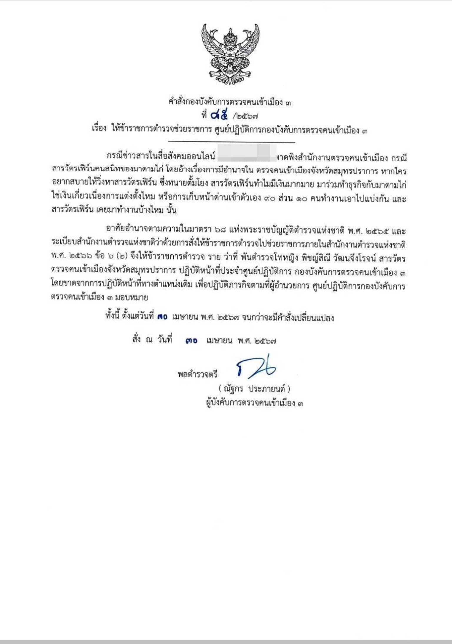 วันที่ 2 พ.ค.2567 ผู้สื่อข่าวรายงาน ว่า พล.ต.ต.ณัฐกร ประภายนต์ ผู้บังคับการตรวจคนเข้าเมือง มีหนังสือคำสั่งกองบังคับการตรวจคนเข้าเมือง 3 ที่ 45/2567 ลงวันที่ 30 เม.ย.2567 เรื่อง ให้ข้าราชการตำรวจช่วยราชการ ศูนย์ปฏิบัติการกองบังคับการตรวจคนเข้าเมือง 3 ใจความว่า กรณีข่าวสารในสื่อสังคมออนไลน์ พาดพิงสำนักงานตรวจคนเข้าเมือง กรณีสารวัตรเฟิร์นคนสนิทของมาดามไก่ โดยอ้างเรื่องการมีอำนาจในตรวจคนเข้าเมืองจังหวัดสมุทรปราการ หากใครอยากสบายให้วิ่งหาสารวัตรเฟิร์น