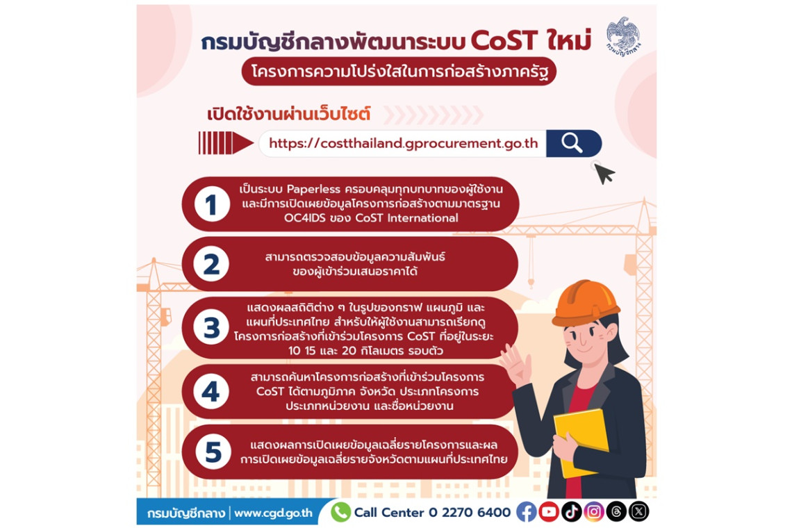 นางแพตริเซีย มงคลวนิช อธิบดีกรมบัญชีกลาง เปิดเผยว่า กรมบัญชีกลางได้พัฒนาระบบโครงการความโปร่งใสในการก่อสร้างภาครัฐ (CoST) ใหม่ ผ่านเว็บไซต์ https://costthailand.gprocurement.go.th เพื่อรองรับการดำเนินงานตามประกาศคณะกรรมการความร่วมมือป้องกันการทุจริต โดยเว็บไซต์ CoST ใหม่ ได้เปิดใช้งานตั้งแต่วันที่ 2 พฤษภาคม 2567 เป็นต้นไป ซึ่งเว็บไซต์ดังกล่าวเป็นระบบ Paperless ครอบคลุมทุกบทบาทของผู้ใช้งานและมีการเปิดเผยข้อมูลโครงการก่อสร้างตามมาตรฐาน OC4IDS ของ CoST International ในรูปแบบของ json file เพื่อให้นักพัฒนาระบบสามารถนำข้อมูลไปวิเคราะห์ต่อยอด และตรวจสอบข้อมูลความสัมพันธ์ของผู้เข้าร่วมเสนอราคาได้ และมีการแสดงผลสถิติต่างๆในรูปของกราฟ แผนภูมิ และแผนที่ประเทศไทย สำหรับให้ผู้ใช้งานเรียกดูโครงการก่อสร้างที่เข้าร่วมโครงการ CoST ที่อยู่ในระยะ 10 15 และ 20 กิโลเมตรรอบตัว ตลอดจนสามารถค้นหาโครงการก่อสร้างที่เข้าร่วมโครงการ CoST ได้ตามภูมิภาค จังหวัด ประเภทโครงการ ประเภทหน่วยงาน และชื่อหน่วยงาน และแสดงผลระดับร้อยละการเปิดเผยข้อมูลเฉลี่ยตามจังหวัดในแผนที่ประเทศไทยได้ ซึ่งเว็บไซต์ CoST ใหม่ จะอำนวยความสะดวกให้กับภาคประชาชนในการติดตามข้อมูลโครงการก่อสร้างที่เข้าร่วมโครงการ CoST ได้มากยิ่งขึ้น
