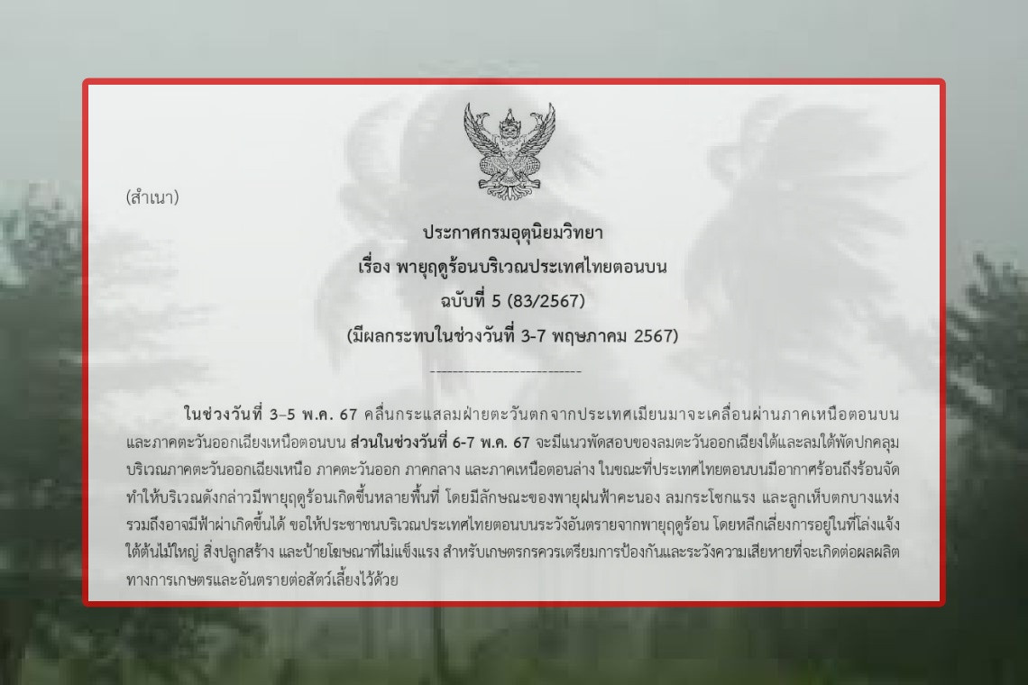 วันที่ 3 พฤษภาคม พ.ศ. 2567 เวลา 06.00 น. นางสาวกรรวี สิทธิชีวภาค อธิบดีกรมอุตุนิยมวิทยา ออกประกาศกรมอุตุนิยมวิทยา เรื่อง พายุฤดูร้อนบริเวณประเทศไทยตอนบน ฉบับที่ 5 (83/2567)(มีผลกระทบในช่วงวันที่ 3-7 พฤษภาคม 2567)