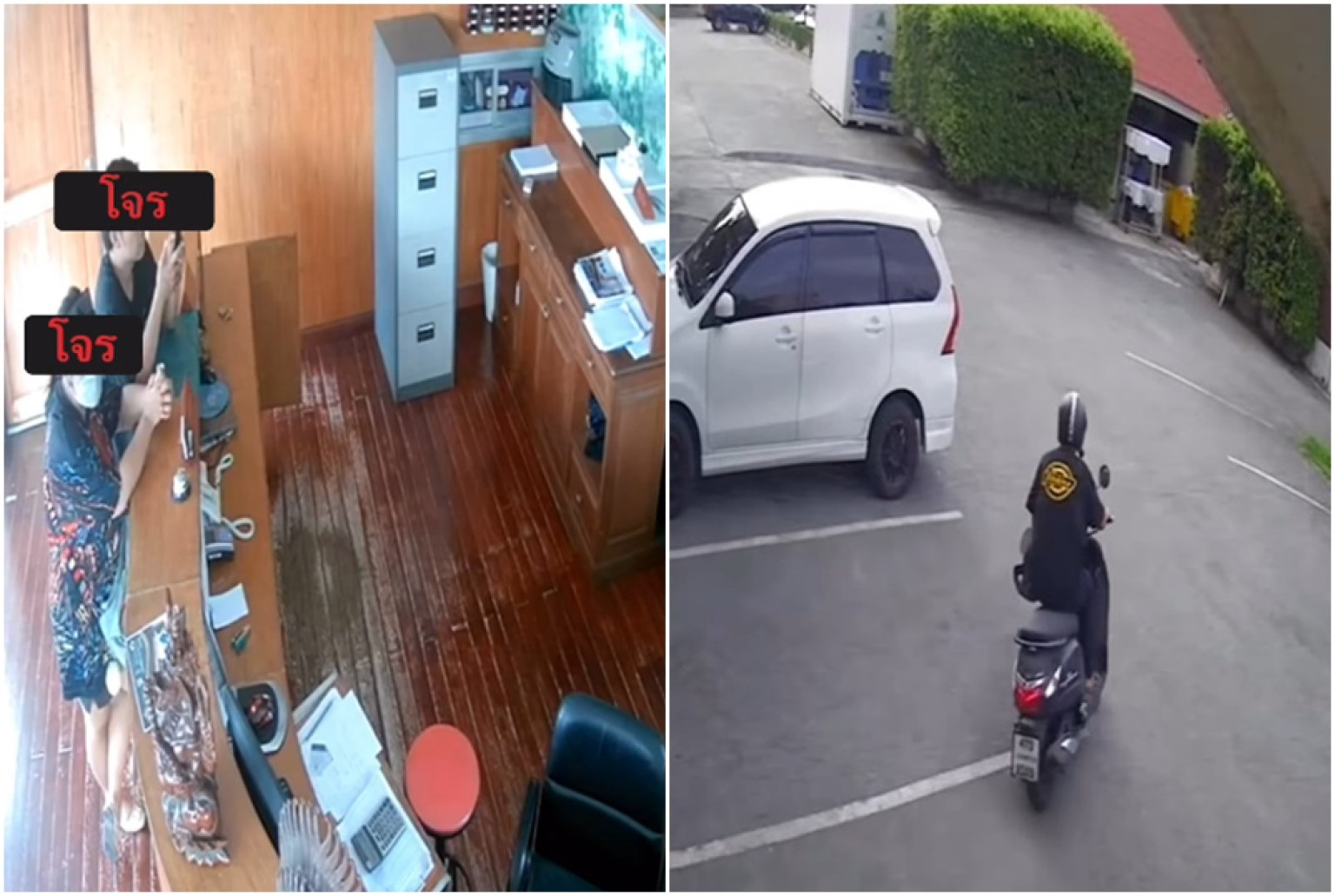 ชายหญิงคู่นี้ แกล้งทำเหมือนจะมาเปิดห้องพักของค่ายมวย แต่อาศัยจังหวะเผลอของพนักงาน แล้วฉกกุญแจมอเตอร์ไซค์ขับหนีออกไปเลย
