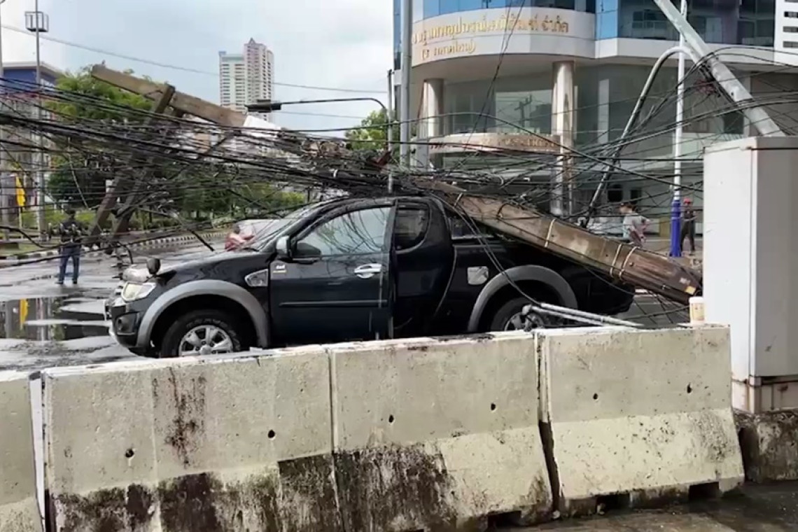 จากการสอบถามคนขับรถมิตซูบิชิ ไทตัน สีดำ ที่ถูกเสาไฟล้มทับ ทราบว่าตอนนั้นมีรถจอดอยู่หลายคันและอยู่อยู่ก็เกิดฝนแล้วลมมาแรง สำหรับส่วนตัวไม่ได้รับบาดเจ็บอะไร สาเหตุเกิดจากป้ายโฆษณาปลิวมาพาดสายไฟจึงทำให้ เสาไฟล้ม