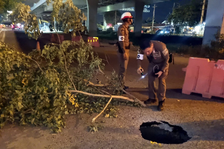 เมื่อเวลา 19.00 น. วันที่ 5 พ.ย.67 เจ้าหน้าที่ตำรวจ สภ.ชัยพฤกษ์ ได้รับแจ้งเหตุถนนทรุดตัวลึกเป็นวงกลมประมาณ 3 เมตร เส้นผ่าศูนย์กลาง 1 เมตร ที่เกิดเหตุบริเวณ ถนนเลนซ้ายใกล้จุดกลับรถ ใต้สะพานพระราม 4 ปากทางเข้าซอยวัดบางจาก ถ.ชัยพฤกษ์ ต.บางตะนัย อ.ปากเกร็ด จ.นนทบุรี โดยเจ้าหน้าที่ตำรวจตำรวจ นำกรวยและแผงกั้นมาตั้งบริเวณหลุมดังกล่าว เพื่อรอเจ้าหน้าที่ และหน่วยงานที่เกี่ยวข้อง เร่งดำเนินการแก้ไขต่อไป ซึ่งจุดที่ถนนทรุดตัวดังกล่าว อยู่แนวเดียวกับเหตุการณ์ถนนทรุดหน้าวัดบ่อเมื่อ วันที่ 6 เม.ย.67 ที่ผ่านมา