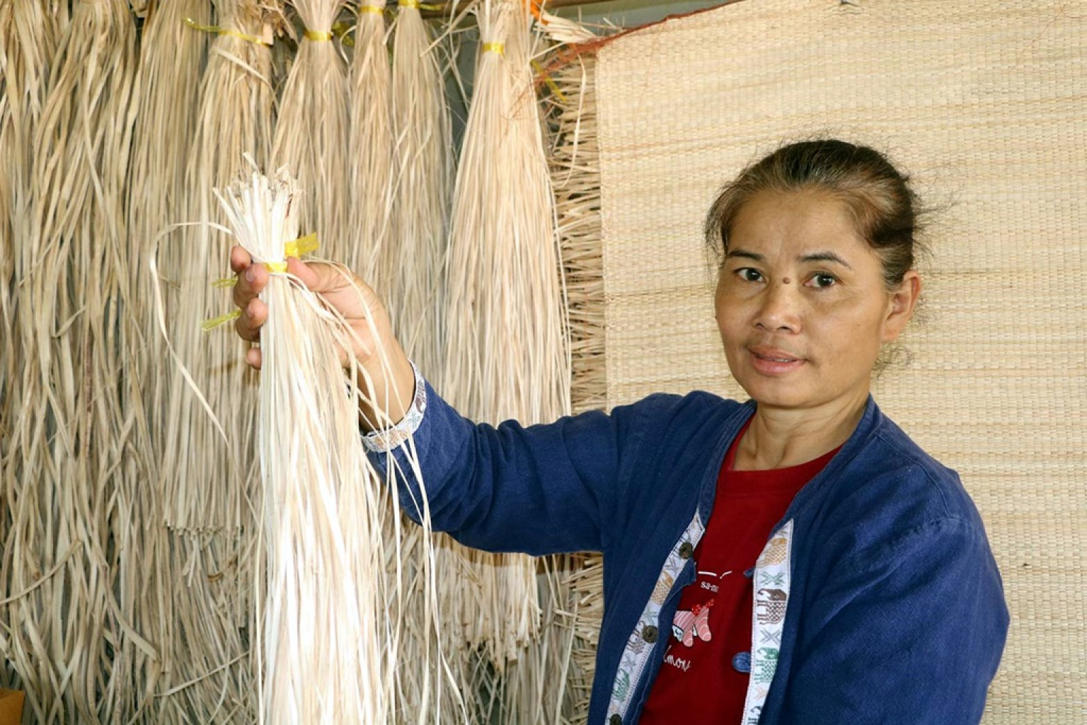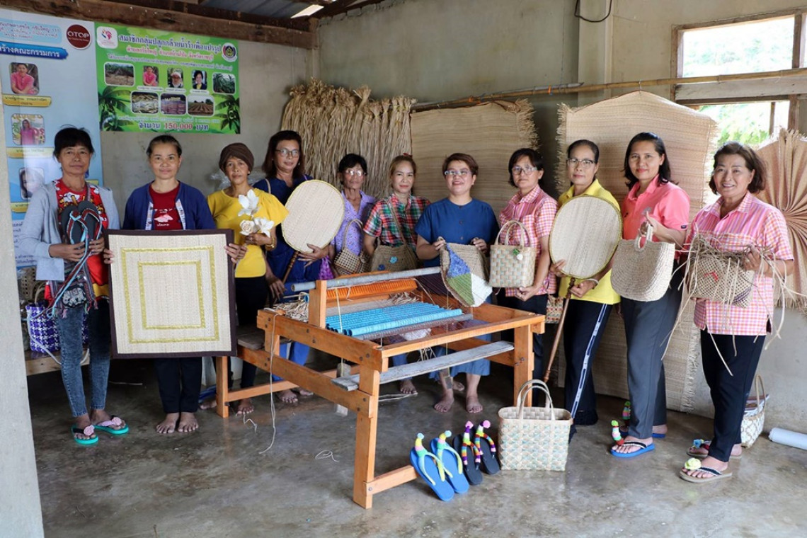 ผศ.ปรียาพร ทองผุด สาขาวิชาศิลปศึกษา คณะมนุษยศาสตร์และสังคมศาสตร์ มหาวิทยาลัยราชภัฏหมู่บ้านจอมบึง กล่าวว่า โครงการส่งเสริมพลังชุมชนขับเคลื่อนเศรษฐกิจฐานรากตามหลักปรัชญาเศรษฐกิจพอเพียง ได้รับมอบหมายจาก ผศ.ดร.ชัยฤทธิ์ ศิลาเดช อธิการบดีมหาวิทยาลัยราชภัฏหมู่บ้านจอมบึง ทำงานภายใต้ยุทธศาสตร์ราชภัฏเพื่อการพัฒนาท้องถิ่น ได้ทำงานในพื้นที่กรับใหญ่และพื้นที่โดยรอบ พบว่าชุมชนมีอาชีพหลายหลากหลาย ต้องการความรู้และส่งเสริมเรื่องผลิตภัณฑ์ชุมชนนำไปสู่รายได้ จึงให้ชุมชนที่มีทุนเดิมอยู่แล้ว ร่วมมือกันตั้งอยู่บนพื้นฐานหลักปรัชญาเศรษฐกิจพอเพียง ใช้องค์ความรู้เข้ามาช่วยส่งเสริม โดยมีภาคีเครือข่ายเข้ามาช่วยดูแลขับเคลื่อน ในเรื่องการทอเสื่อ และนำเสื่อมาแปรรูปเป็นอาสนะพระ พวงหรีด ตาลปัตร จากเดิมมีอาชีพการเย็บผ้าไตรอยู่แล้ว ในพื้นที่ปลูกกล้วยและขายผลกล้วย มีการนำมาแปรรูปเป็นกล้วยตาก คิดว่าต้นกล้วยที่ต้องเผาทิ้งเกิดมลภาวะน่าจะนำมาทำเป็นเชือกกล้วย แล้วใช้ทุนภูมิปัญญาเดิม นำเชือกกล้วยมาทอเป็นเสื่อ ทางมหาวิทยาลัยฯได้มาช่วยเรื่องการพัฒนาให้เกิดเป็นผลิตภัณฑ์ เพื่อหากลุ่มลูกค้าใหม่เพิ่มเติมให้ มีการทำงานร่วมกับภาคีเครือข่าย เช่น สำนักงานวัฒนธรรมจังหวัด ให้ชุมชนไปออกบูธจำหน่ายสินค้า เพื่อให้เกิดการเรียนรู้ในการนำเข้ามาปรับปรุงทำให้งานที่ทำอยู่มีการพัฒนายิ่งขึ้นไป