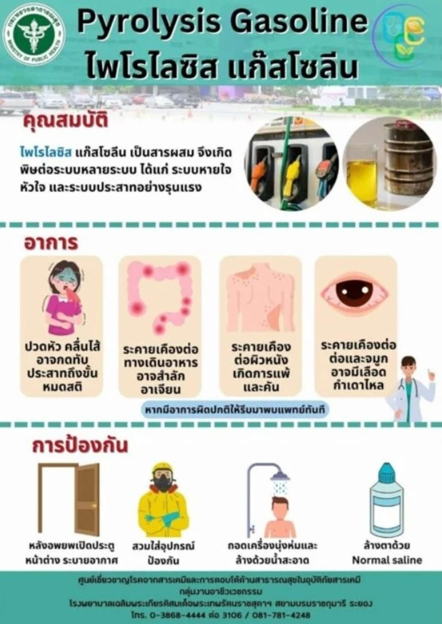 นอกจากนี้ยังได้โพสต์ภาพจาก กระทรวงสาธารณสุข ซึ่งระบุคุณสมบัติ "ไพโรไลซิล แก๊สโซลีน" ว่า เป็นสารผสมจึงเกิดพิษต่อระบบหลายระบบ ได้แก่ ระบบหายใจ หัวใจ และระบบประสาทอย่างรุนแรง